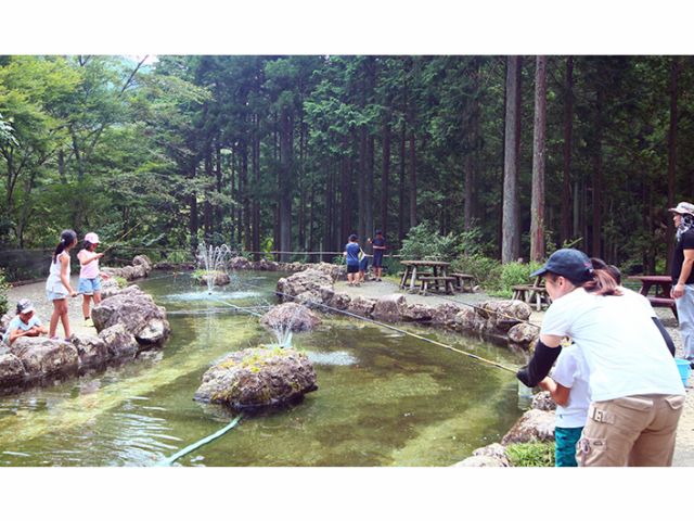 豊富な種類・サイズの魚が泳ぐ「ニジマスの池」「アマゴ・イワナの池」の2つに分かれていて、釣り具のレンタルも可能。