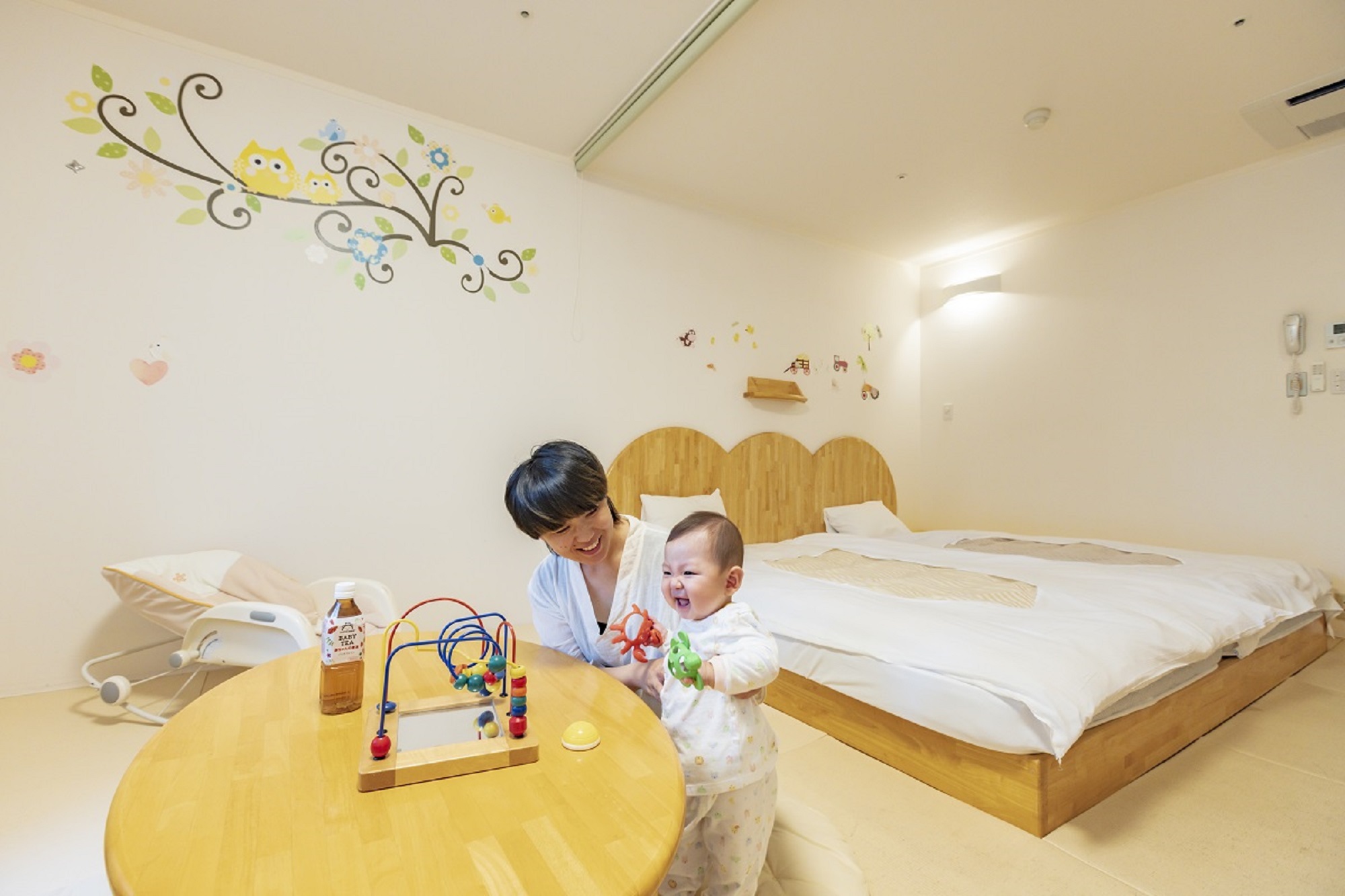 「赤ちゃん連れ専用ルーム」は、赤ちゃんとお母さんの気持ちを考えた和洋室となっており、赤ちゃん用にベビーラック(プルメア)やおしりふき、タオルも2倍など備品も充実しています。
