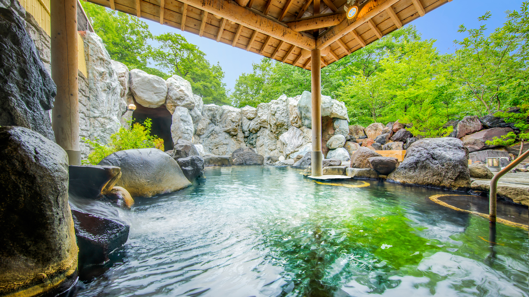 浴場には「露天岩風呂」「露天風呂檜湯」「内湯」「洞窟風呂」もあり、さまざまなお風呂で湯汲みをお楽しみください。
