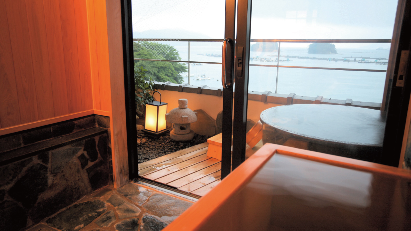 桧の内風呂は、天候を気にせずゆったりと、露天風呂からは目の前に広がる小浜湾の海景を望みながらの湯浴みをお楽しみいただけます!