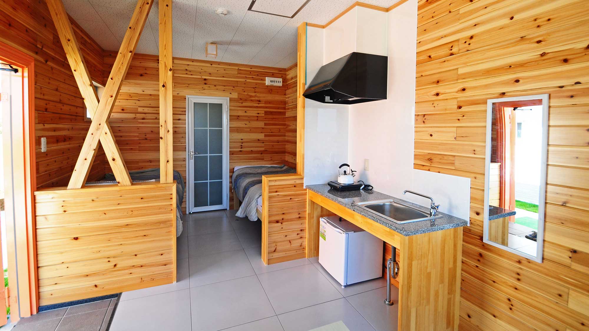 シングルベッド1台、エキストラベッドで最大2名まで可能なコテージタイプと、シングルベッド2台エキストラベッドで最大3名可能なコテージタイプがあります。