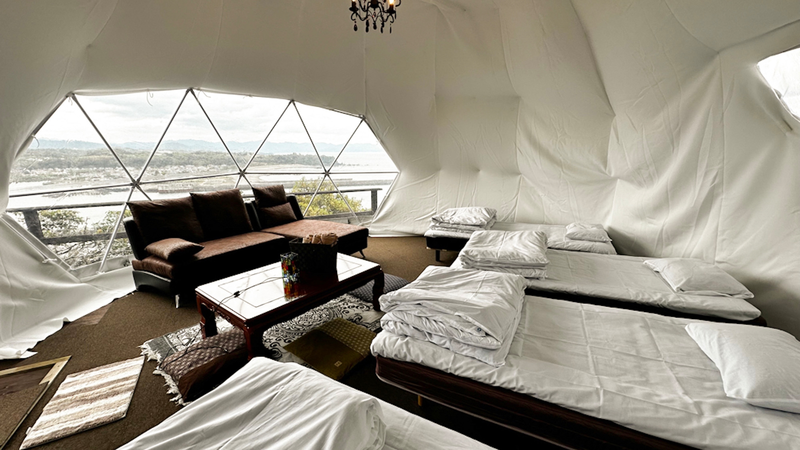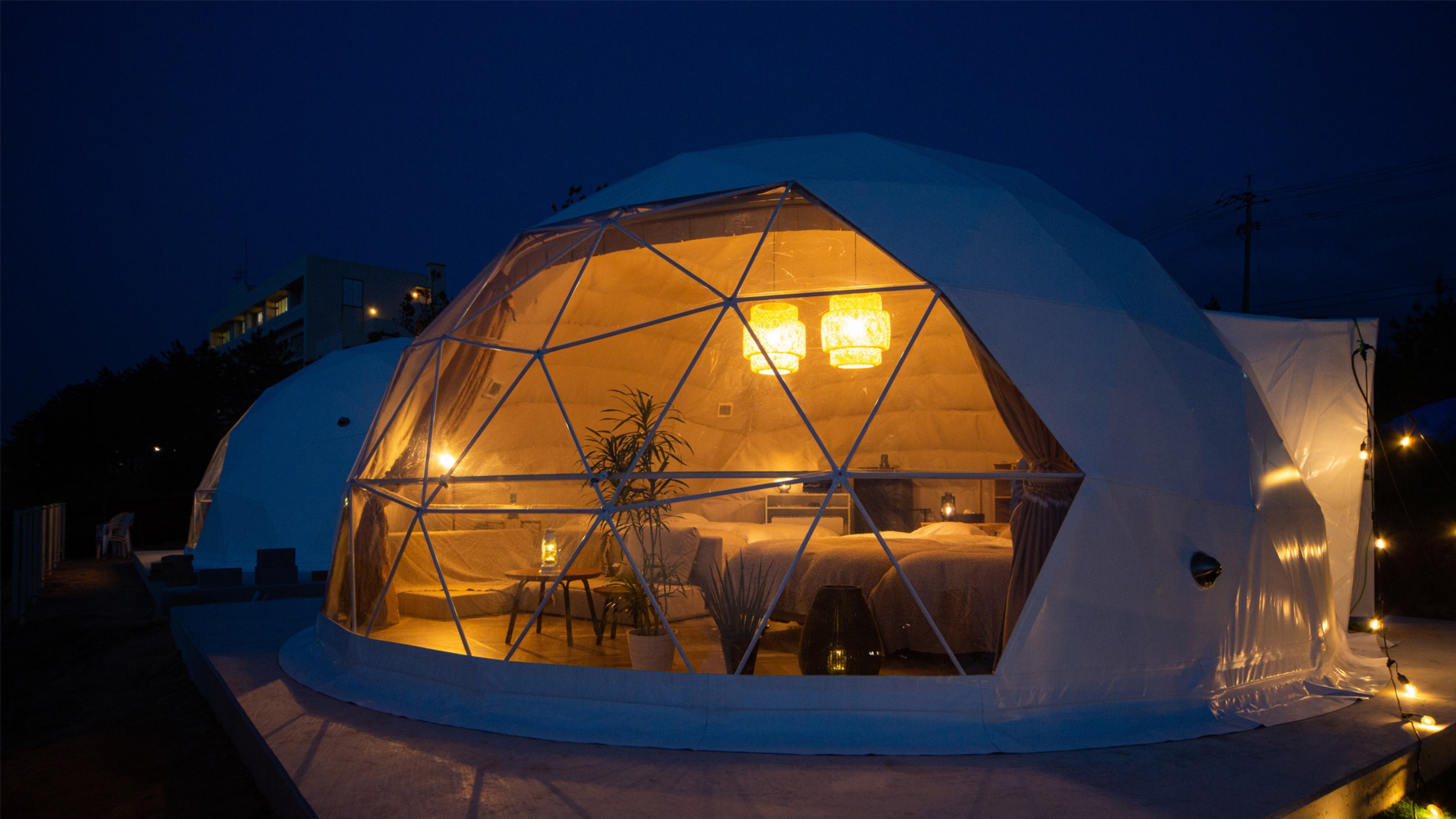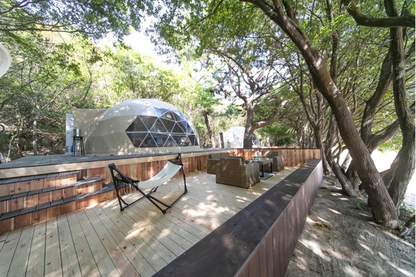 「国民宿舎千畳苑」の隣、「国府海水浴場」の目の前に立つ大型のドームテントを備えたグランピング施設は1日2組限定。