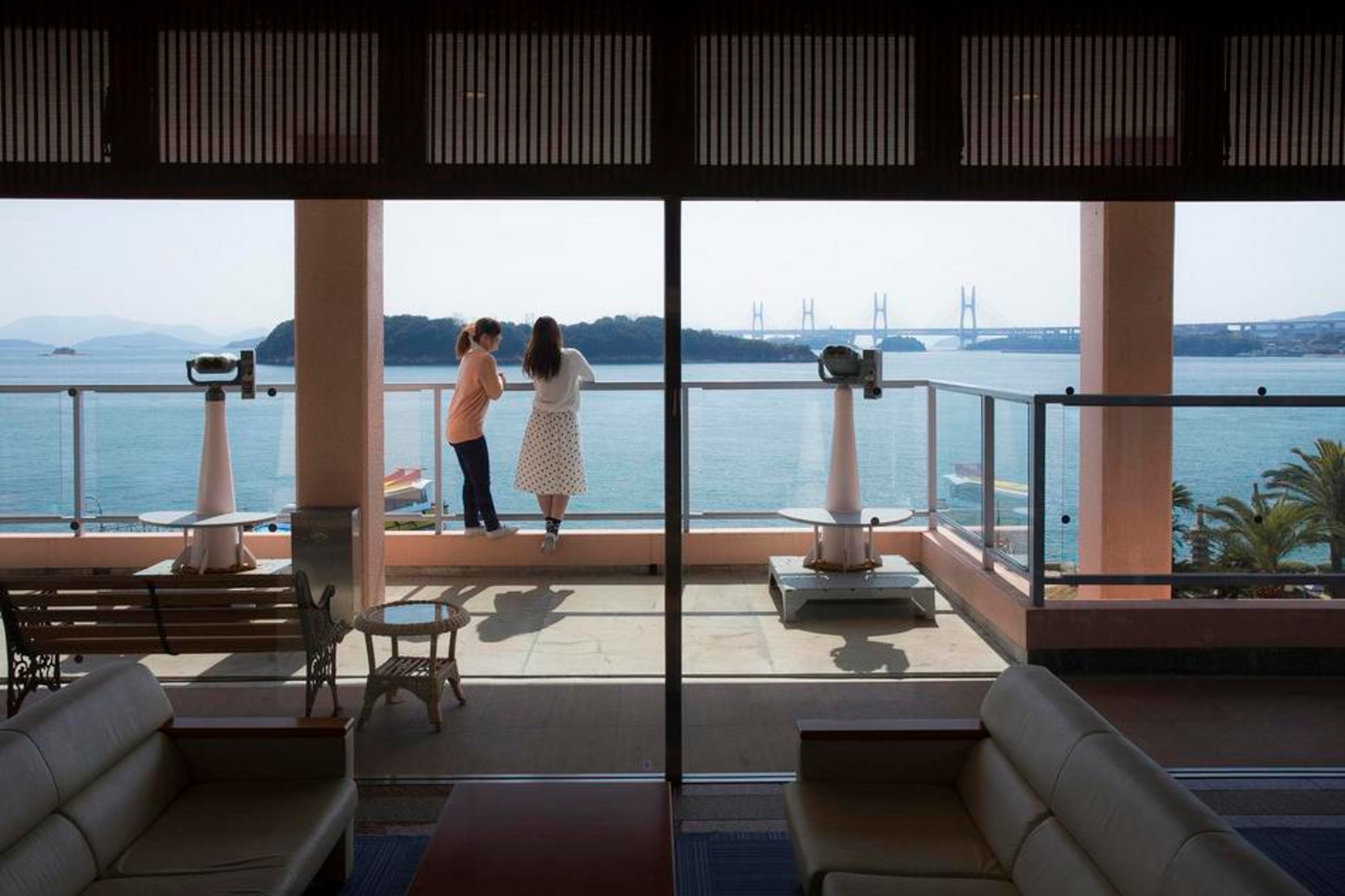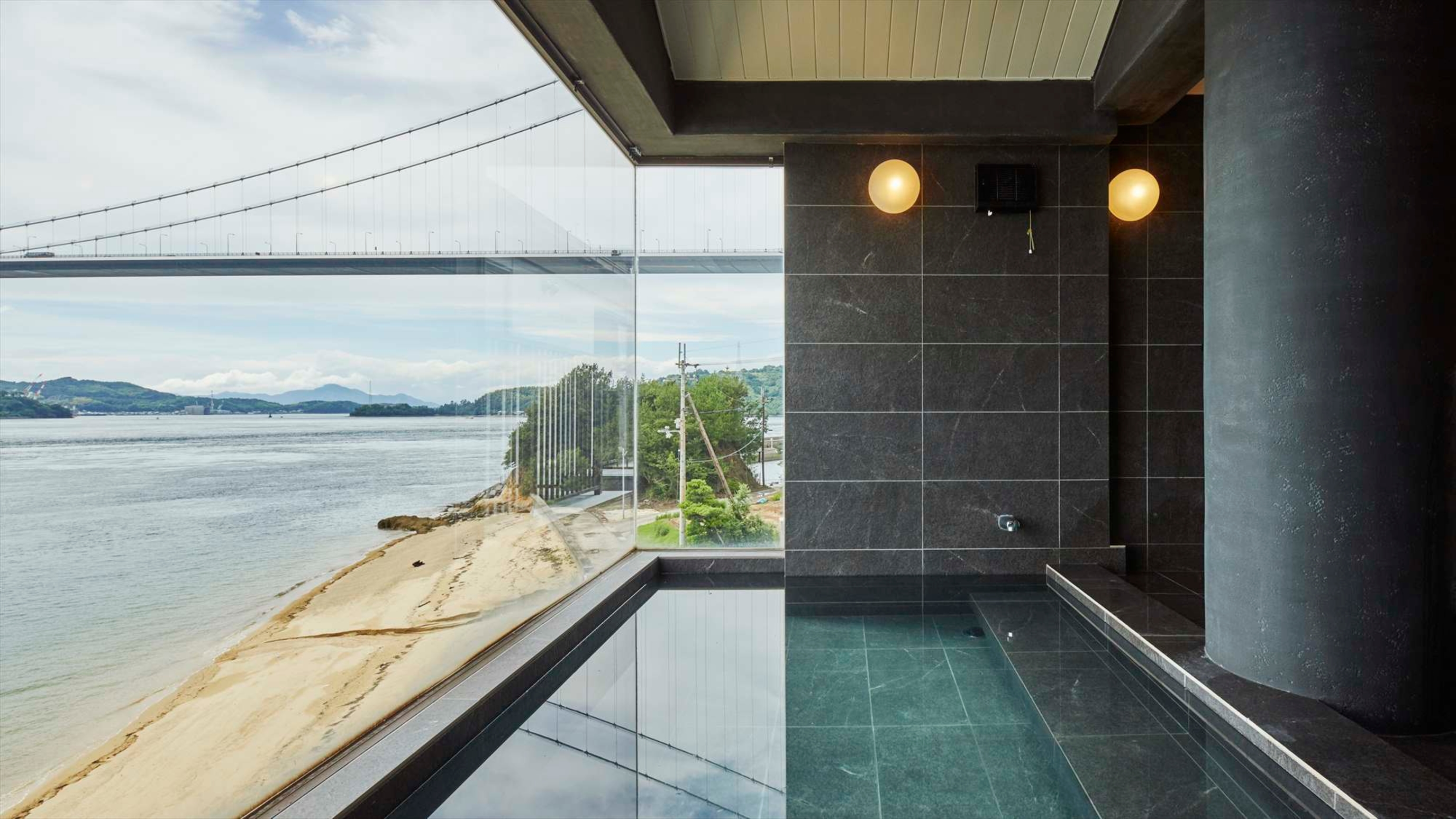 来島海峡大橋と瀬戸内の海が見えるホテル棟のお風呂。