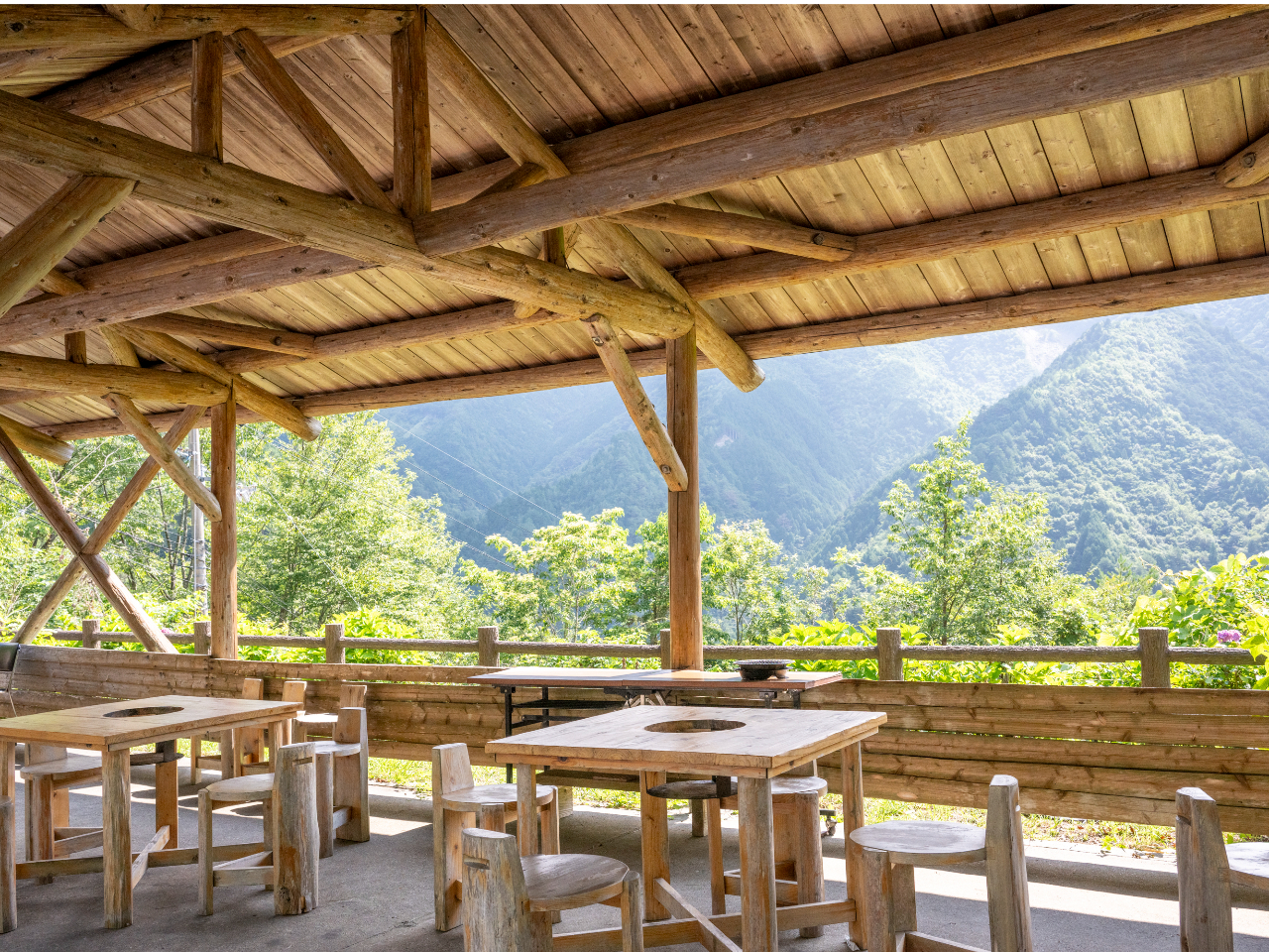 屋根があり雨天でもOK、マウンテンビューの絶景東屋でBBQをお楽しみいただけます!