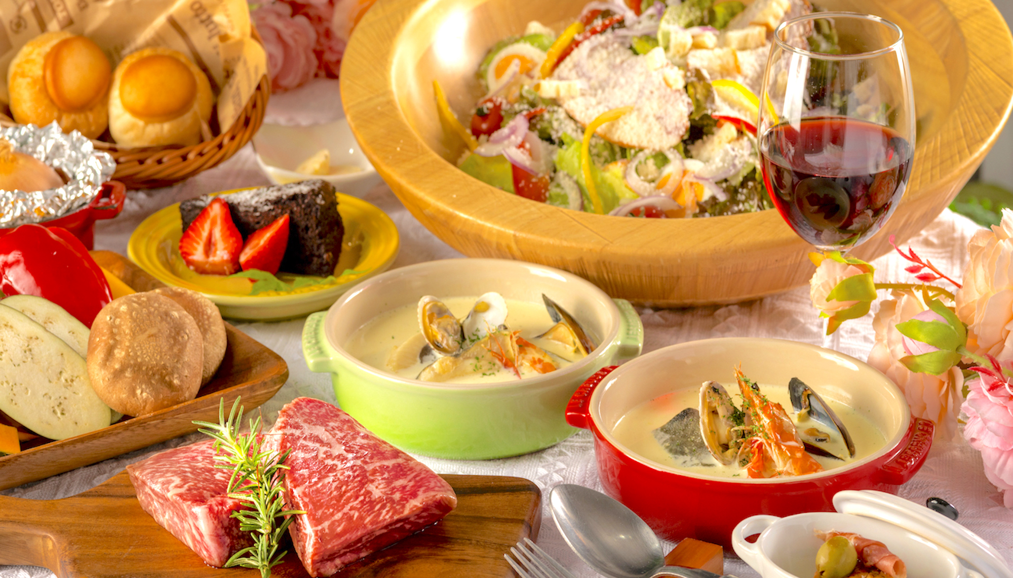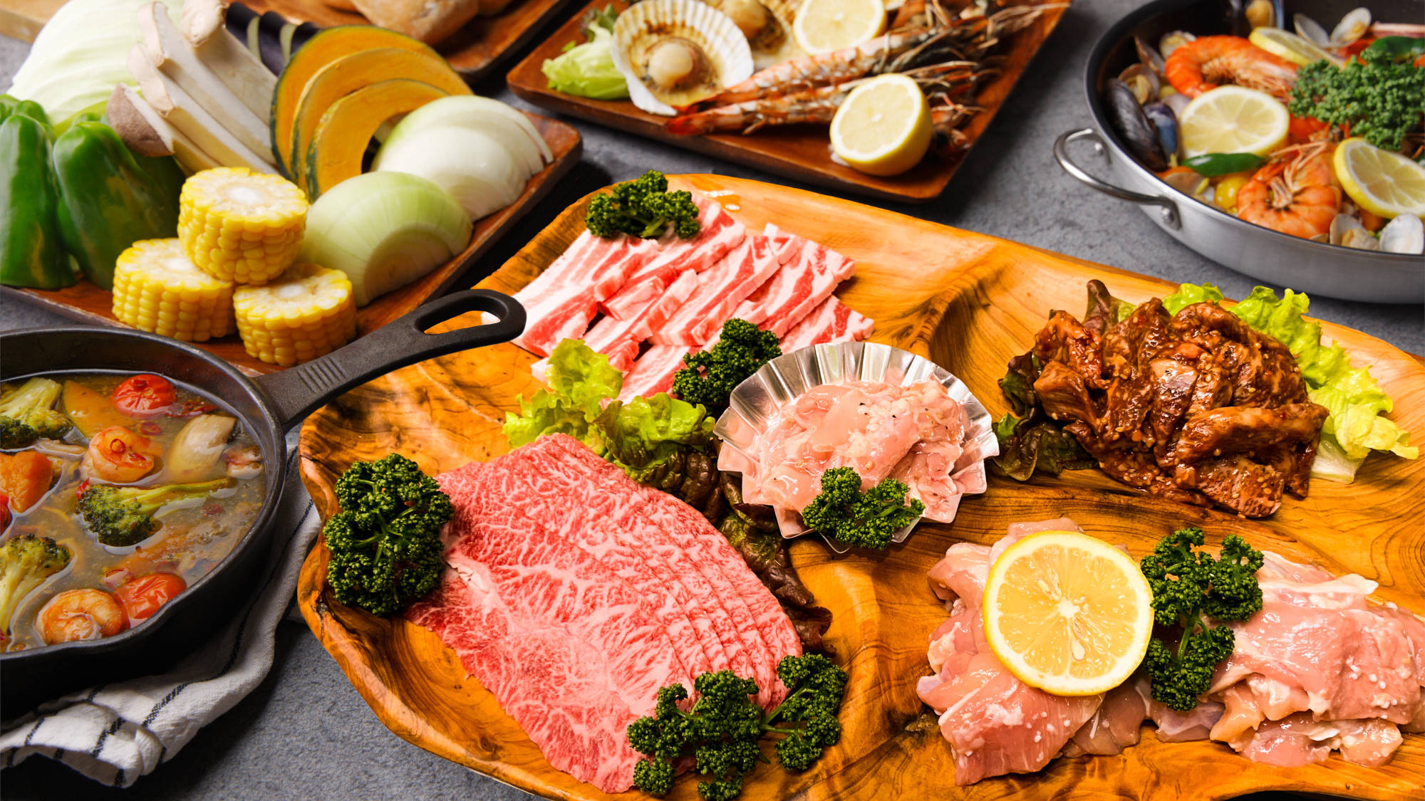本格バーベキューグリルで焼くお肉や海鮮のほかにも、アヒージョや土鍋ご飯、パエリアなどもお楽しみいただけます。