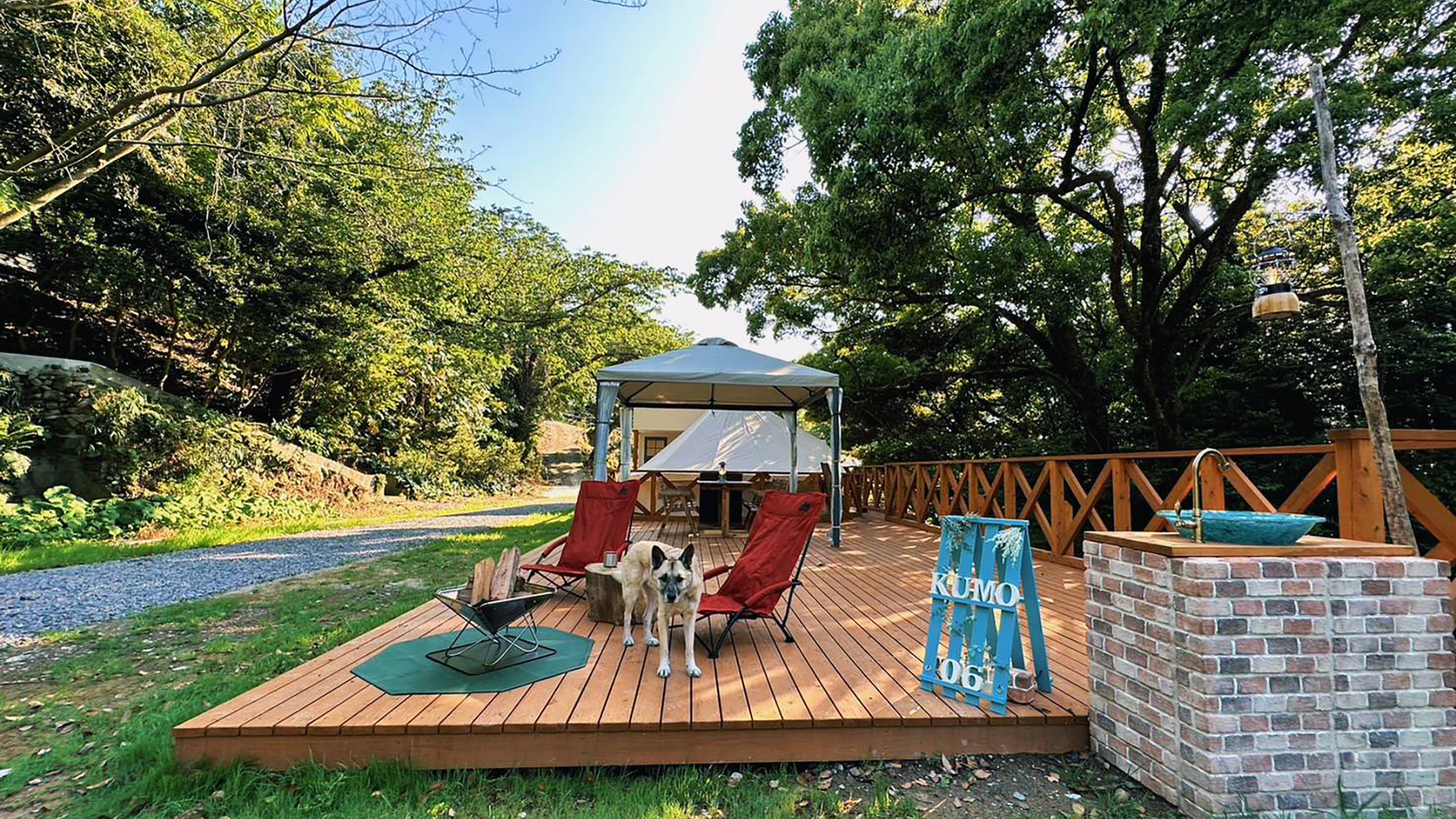 愛犬と一緒に寝れるドームテント6mは離れで広々したウッドデッキ(区画広さ82.6平米)貸切ドッグランも利用可能!
