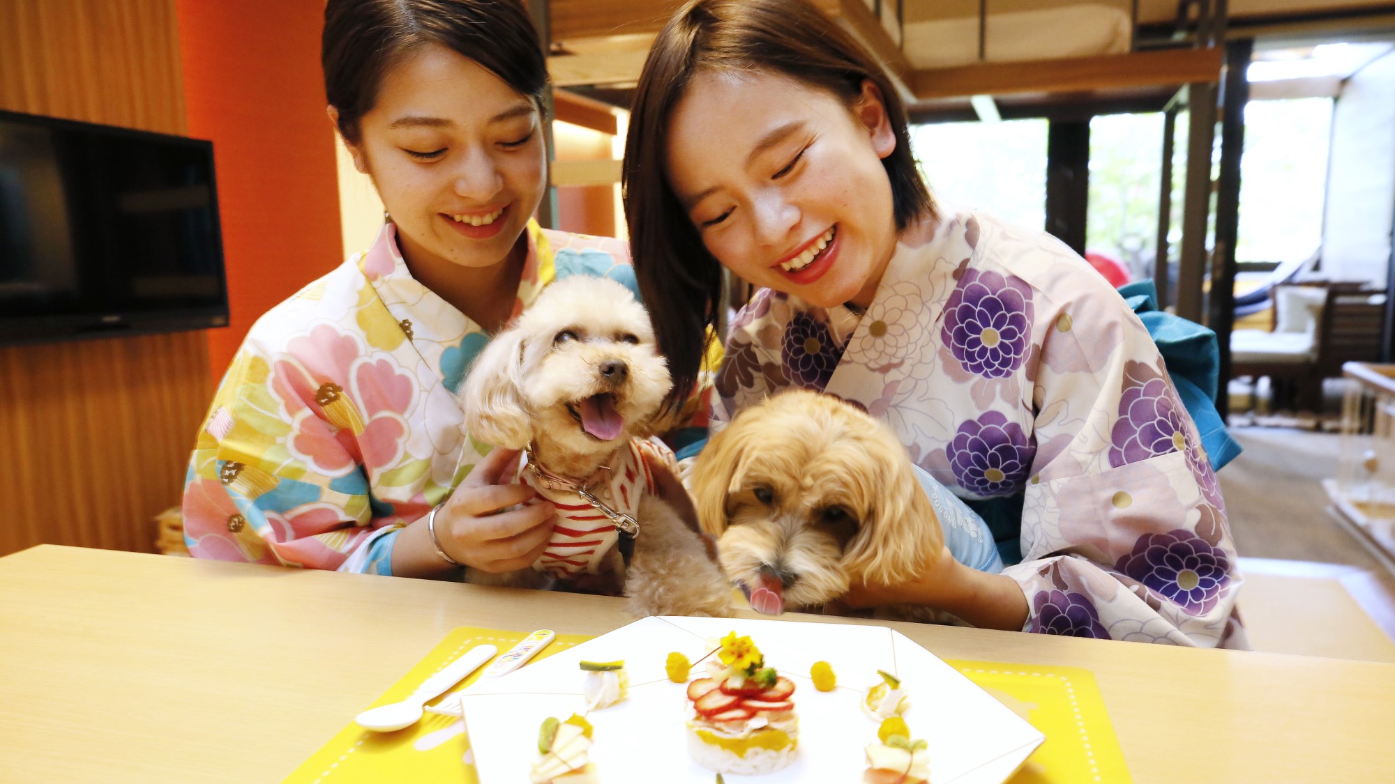 愛犬の食事はお部屋棟内にある専用ダイニングで一緒に食事ができ、ペット用のお風呂で温泉も家族と一緒に利用できますよ!