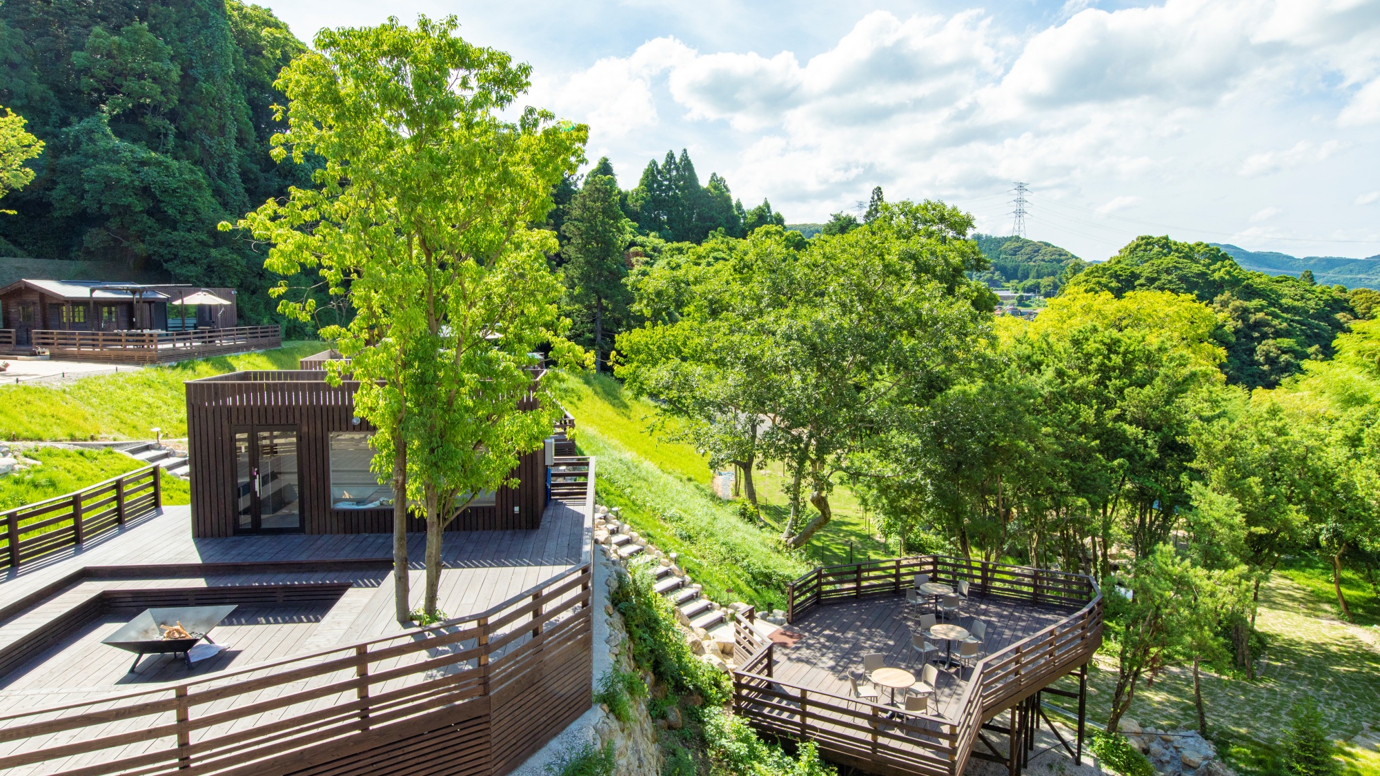 本格薪サウナ、天然水かけ流しの水風呂、絶品料理を堪能できる「グランピング五感」の客室棟の数は、全4タイプの7棟です。