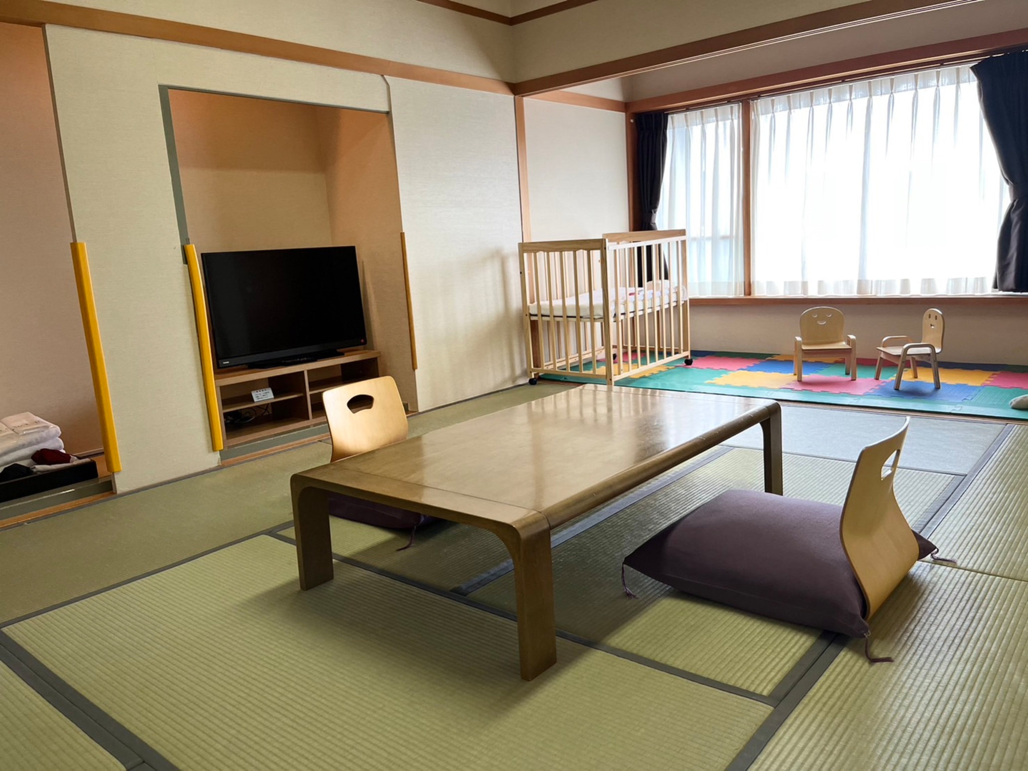 認定のお部屋にはコネクティングルームもあり、ご家族3世代やお友達同士で気兼ねなく過ごすことができ、プレイマットも設置されているので、安心してお子さまを遊ばせることができます!