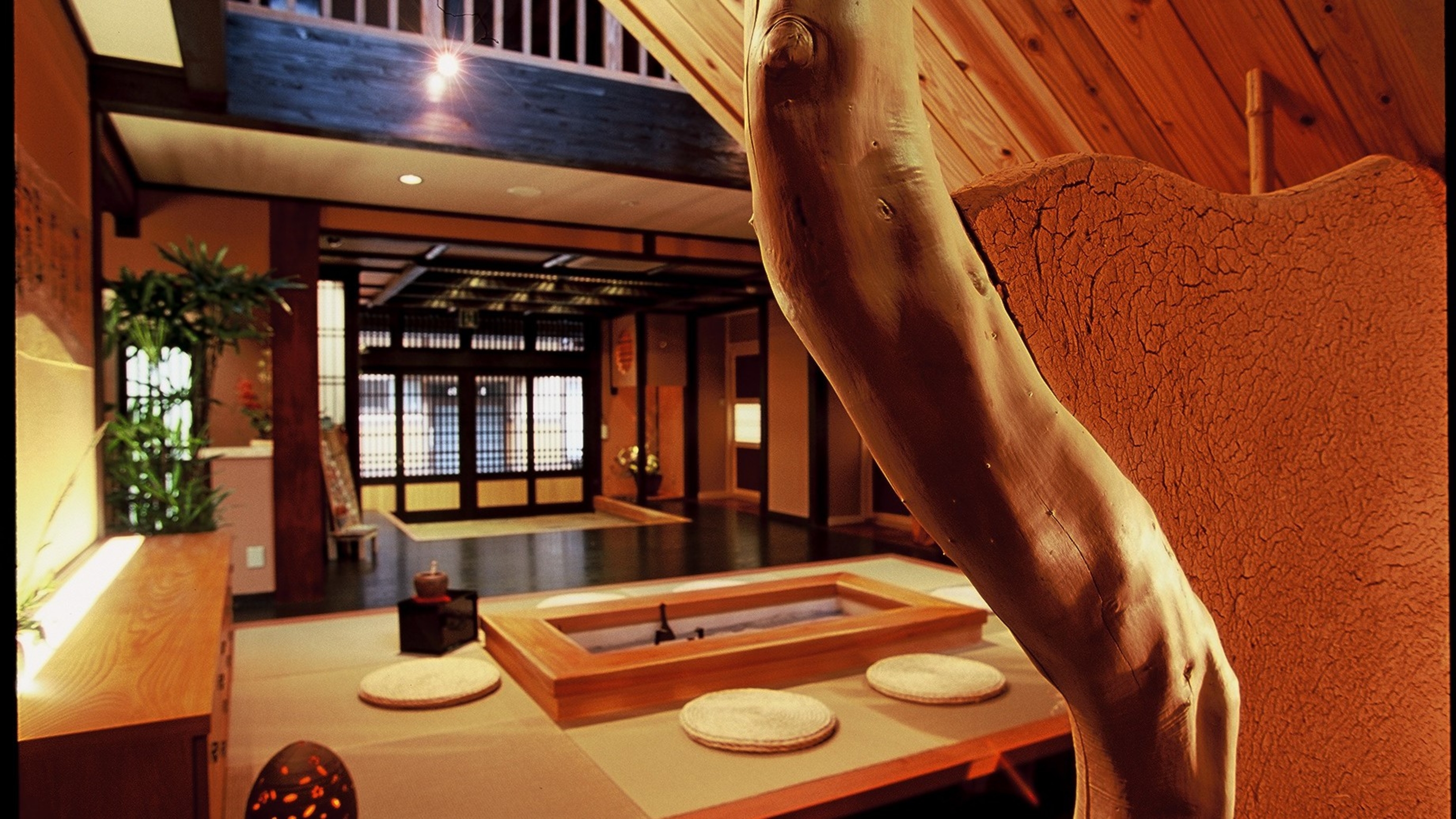 海に面して建つ木造日本建築で、囲炉裏を備える吹き抜けエントランスロビーは、洗練された純和風の趣となっています!