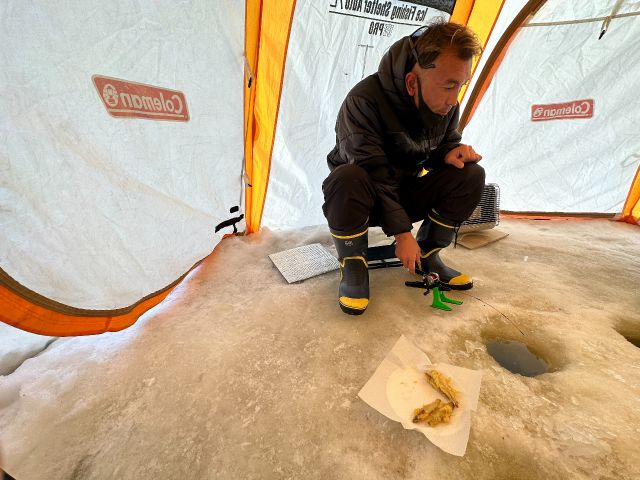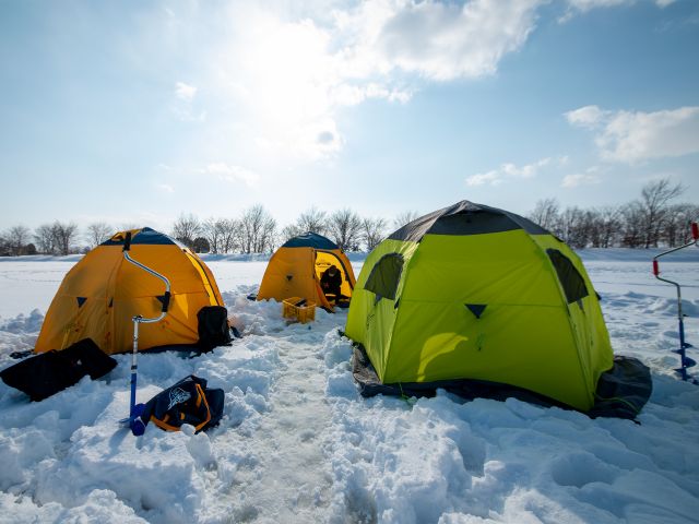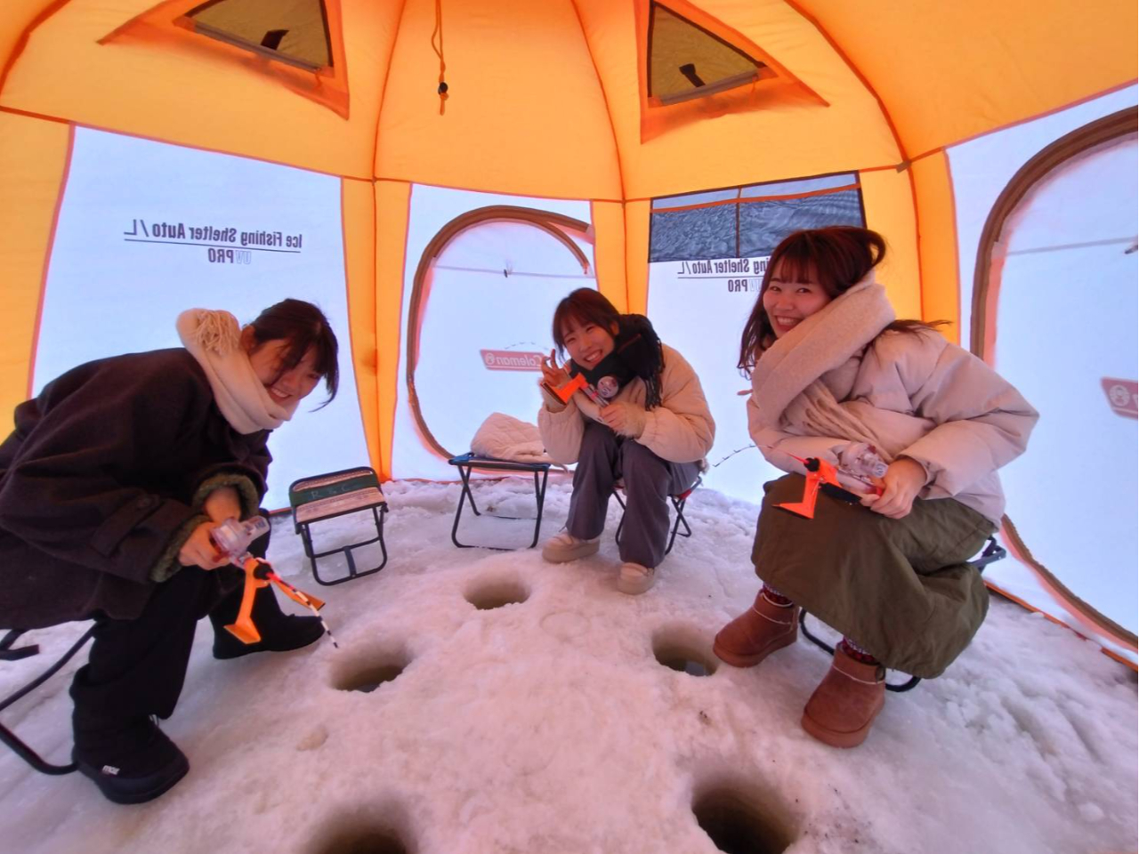 テントや釣り道具はこちらで全てご用意。意外と大変な穴あけやエサ付けはガイドが事前に準備しておくので到着後すぐ釣りが楽しめます!