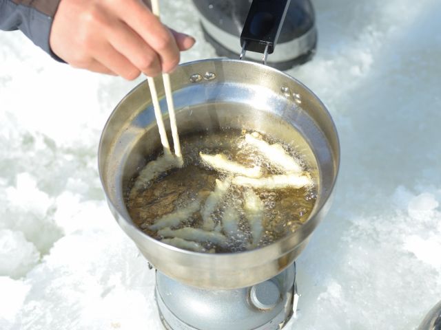 釣れたワカサギはすぐ横のテントで天ぷらに調理!釣りをしながらアツアツサクサクのワカサギ天ぷらが試食できます。