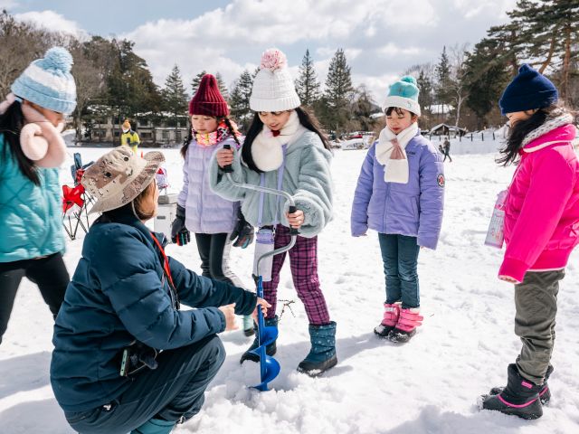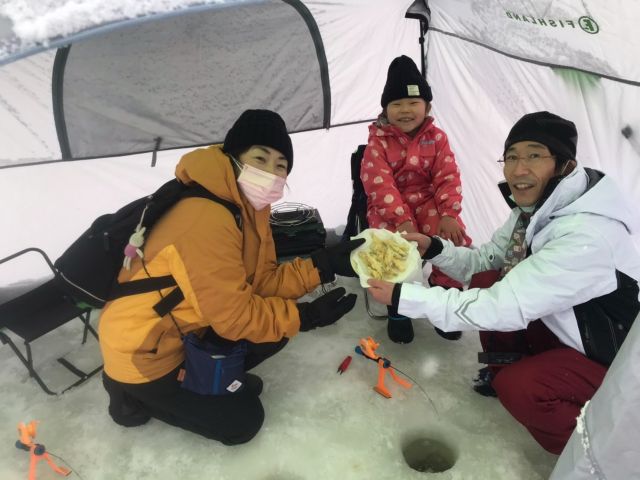 厚く結氷した川面に開けた穴から釣り糸を垂れて、氷下で群れているワカサギを狙い、釣ったワカサギは天ぷらや唐揚などの試食にしてお楽しみいただけます🎵