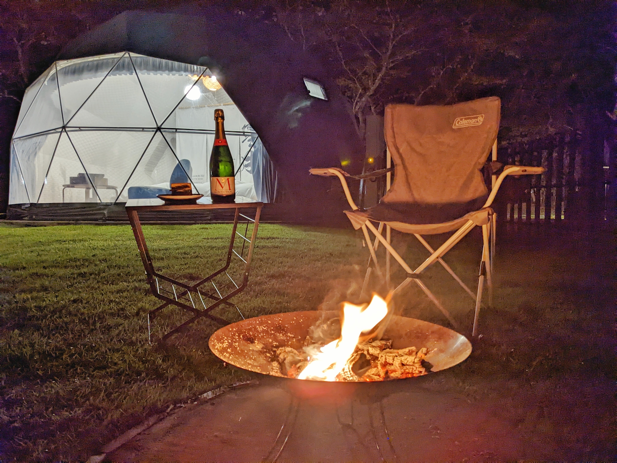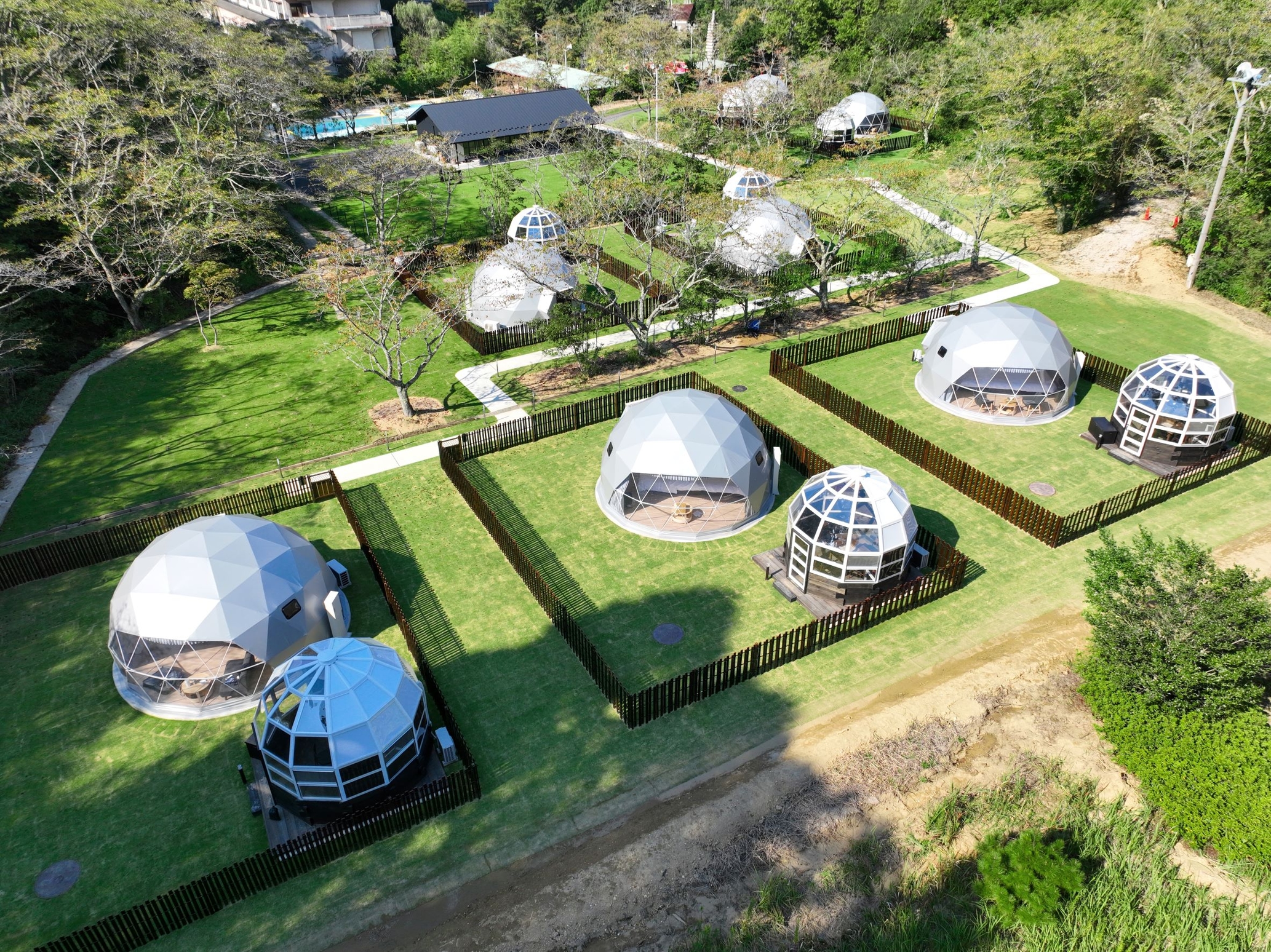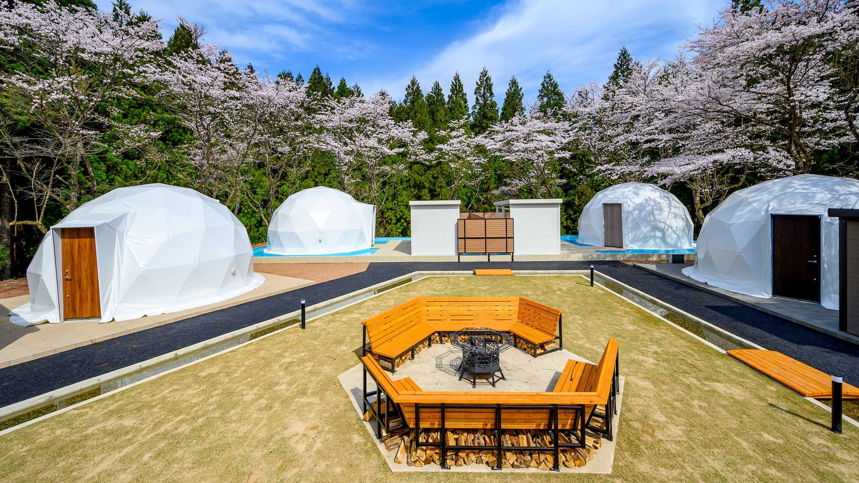 水に浮かぶドームが特徴の「アクア」や、ペット同伴可能でドックラン付きの「エイシア1」「凛2」など、コンセプトの異なる6棟の大型ドーム型の宿泊施設と集いの焚火スペースを完備した、設備充実のグランピング施設となっています!