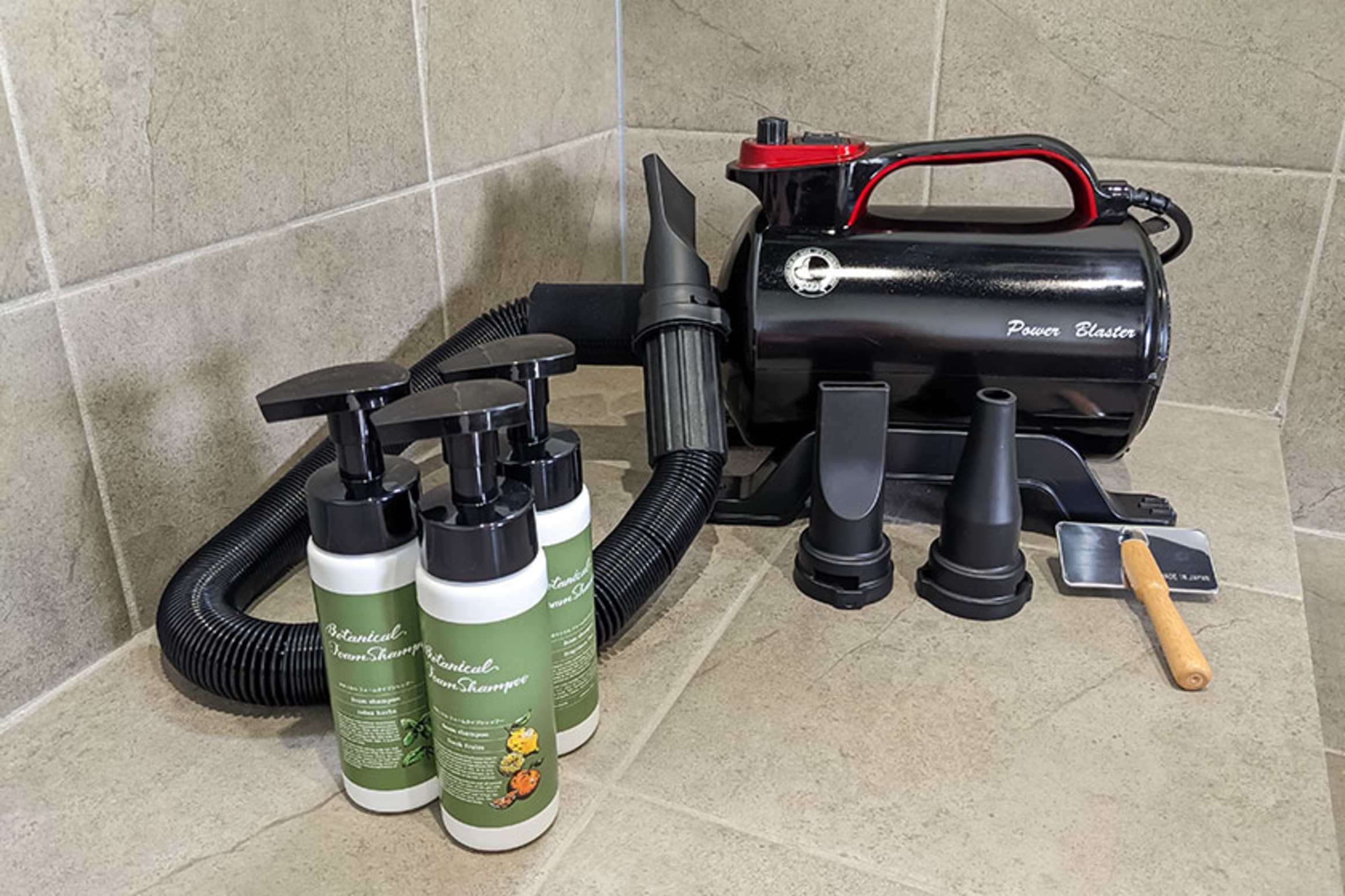 管理棟にはワンちゃん用のシャワールームが2室あり、専用ドライヤーや選べるシャンプーバーも用意しているので安心!
