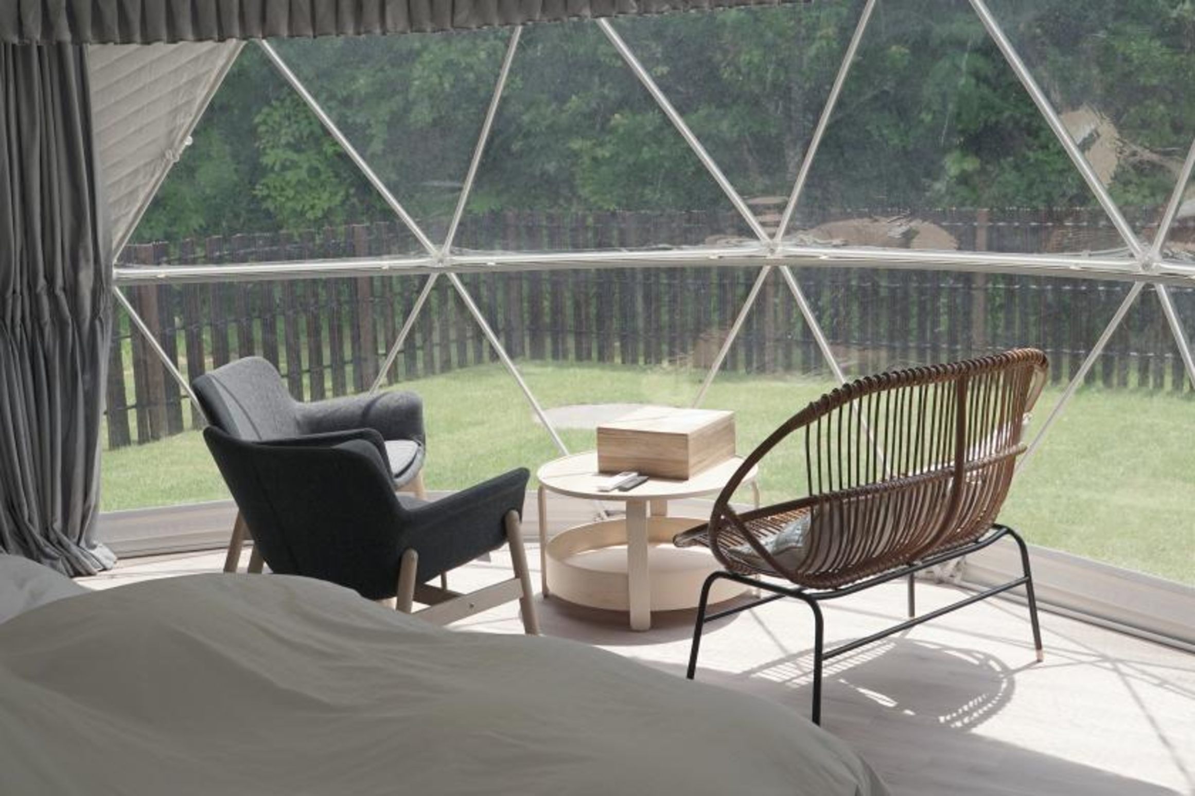 全7棟の客室はラグジュアリーなドームテントとなり、 室内はエアコン完備で一年間を通してワンちゃんも一緒に快適に過ごすことができます。