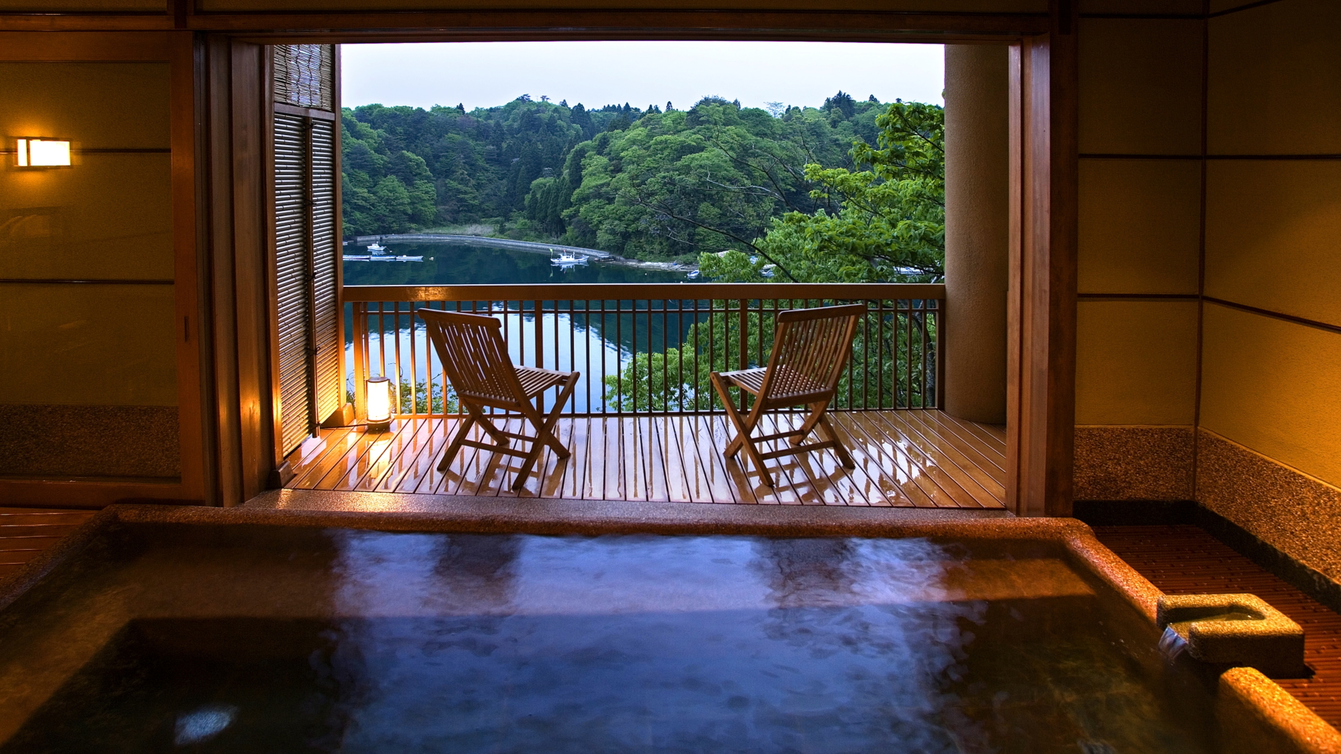 「料理旅館 平成」自慢のお部屋は温泉半露天風呂付スイートルーム「波の香」そして離れの2階に1ルームのみの特別室、120平米の「ロイヤルスイートルーム」