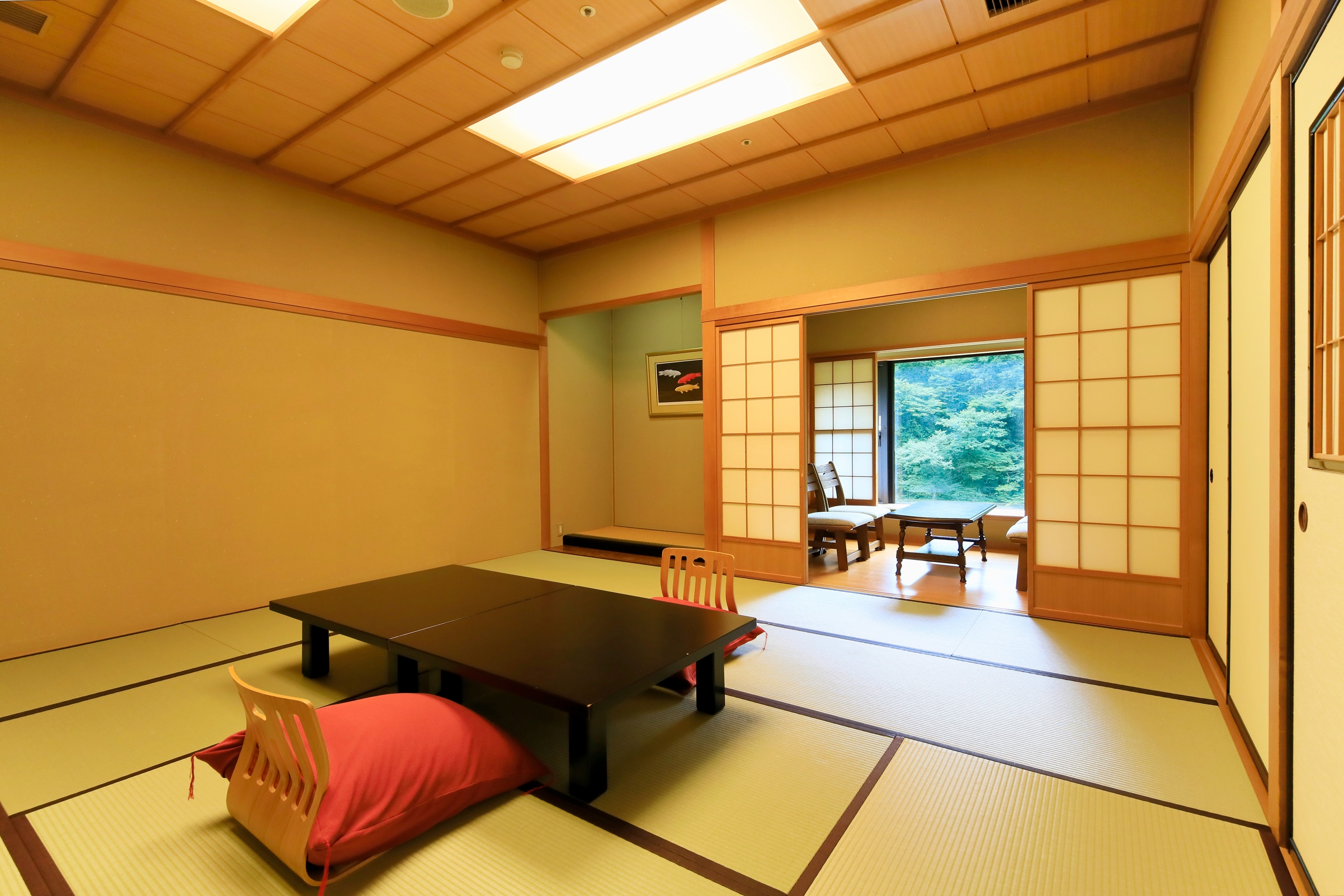 最大8名まで利用できるスタンダードな和室の他、ゆったりくつろげる和室12畳にツインベッドの洋室のスペースを備えた広々とした和洋室も完備。