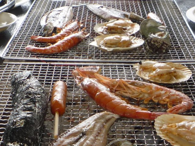・カキ・ホタテ・アジ干物・イカ串・甘えび刺身・ソーセージ・焼き野菜