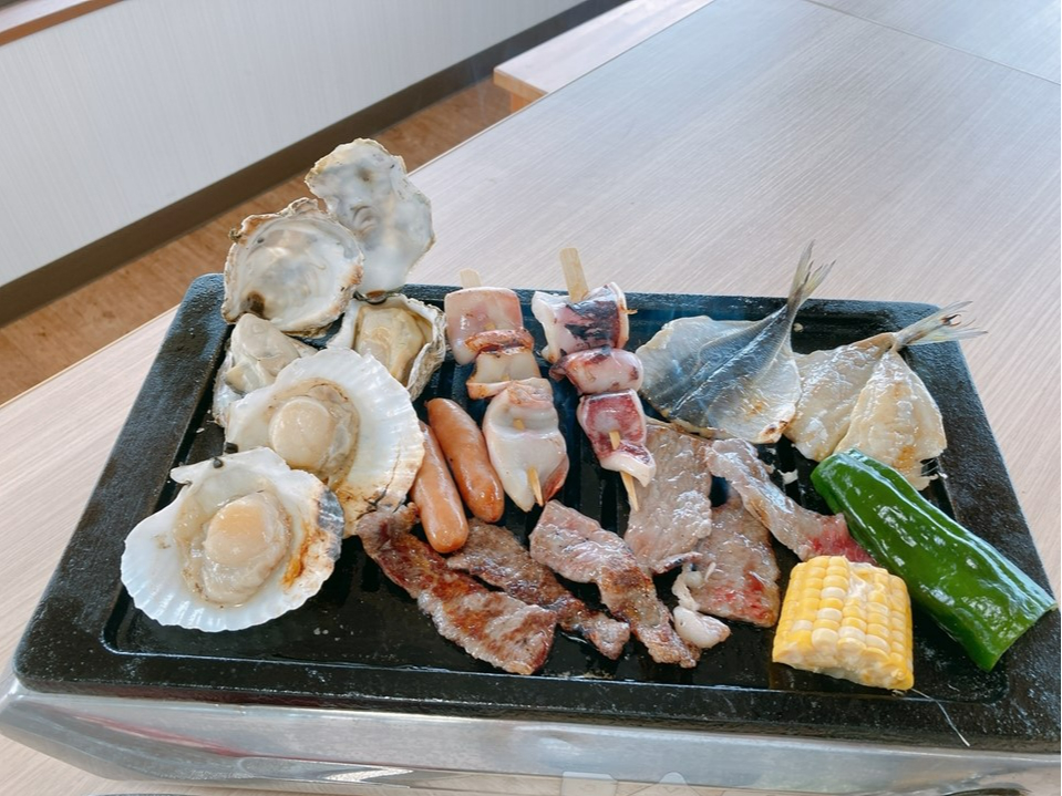 「ちょうべい」での一番人気BBQプランは、海鮮もお肉もしっかりついた「まんぷくプラン・展望風呂入浴付」