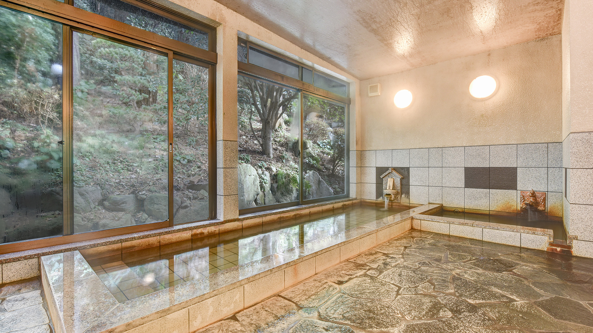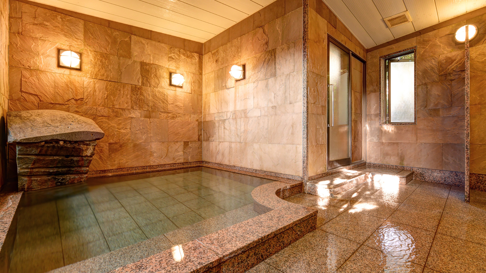 本館・男湯は、壁面、浴槽、床、湯口は全て錆(さび)御影石を使用し、重厚な雰囲気。