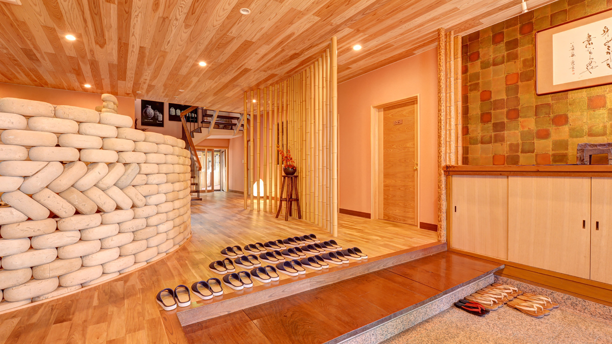 石の湯口には地元陶芸家による古代人の狩猟の絵が線刻されており、共に外には露天の坪風呂を完備します!