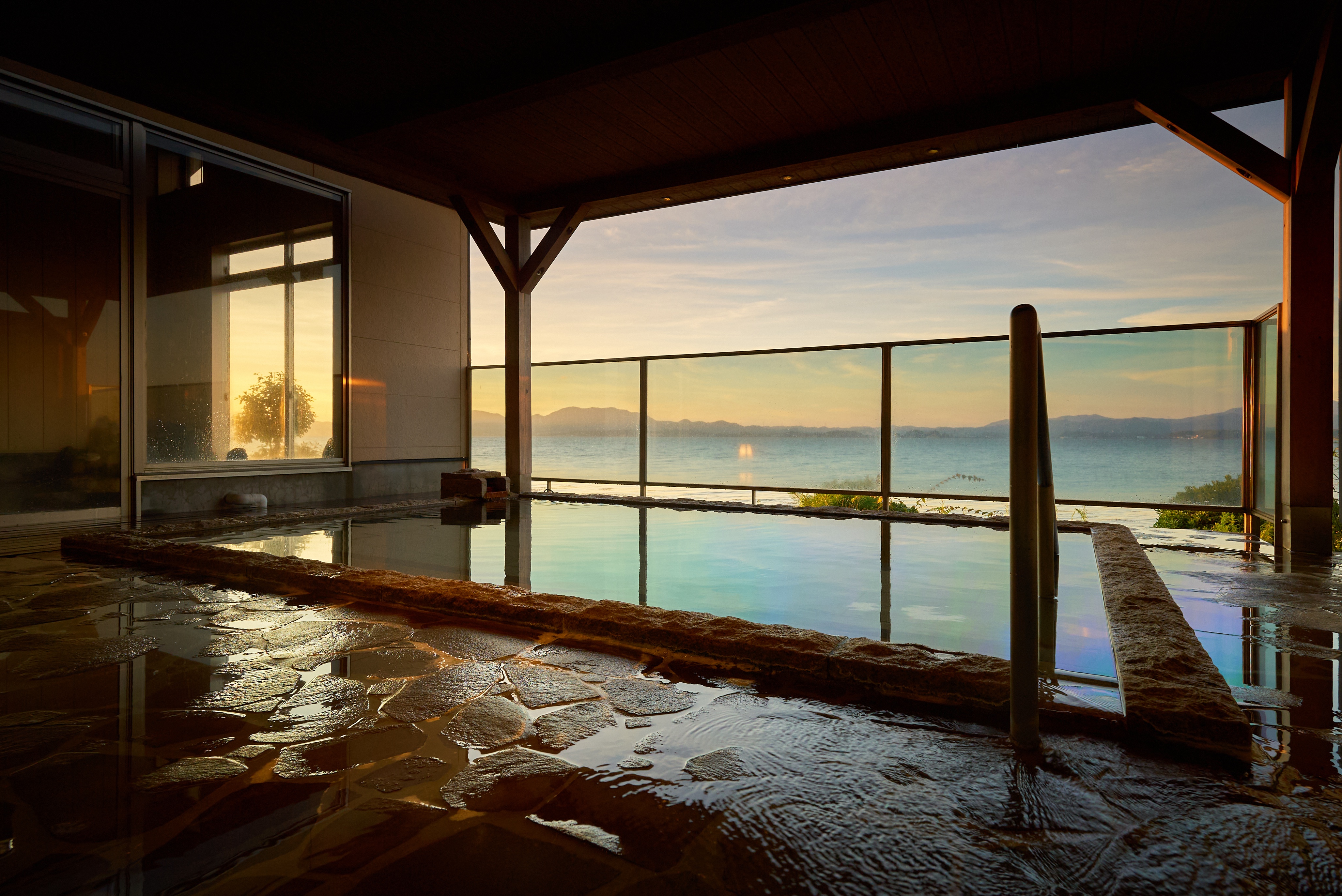 日本三美人の湯として女性に人気の温泉は、内湯の他、四季折々の景色を楽しめる絶景露天風呂、サウナは日本初のセパレート式サウナ室と最深部160㎝の水風呂を完備。