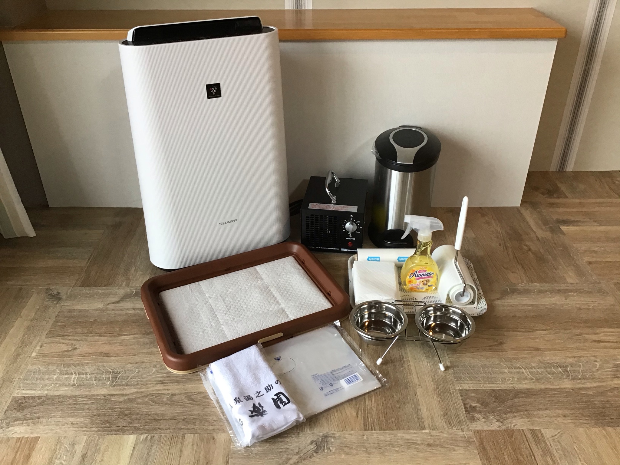 ペットゲージ(124cm×70cm×62.5cm)・ペットシート(レギュラー5枚)・ビニール袋(透明ビニール袋)・タオル(フェイスタオル1枚)・⾷器(餌・⽔⽫)・コロコロ・消臭スプレー・オゾン脱臭機