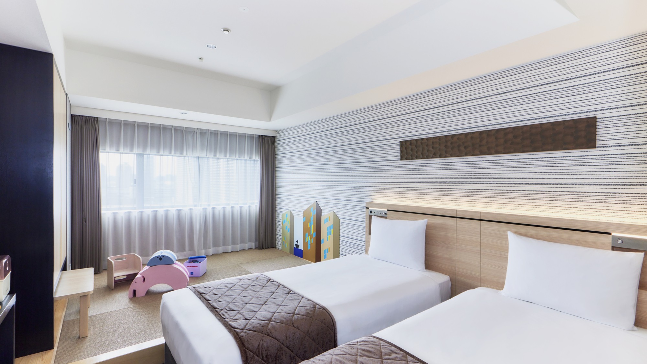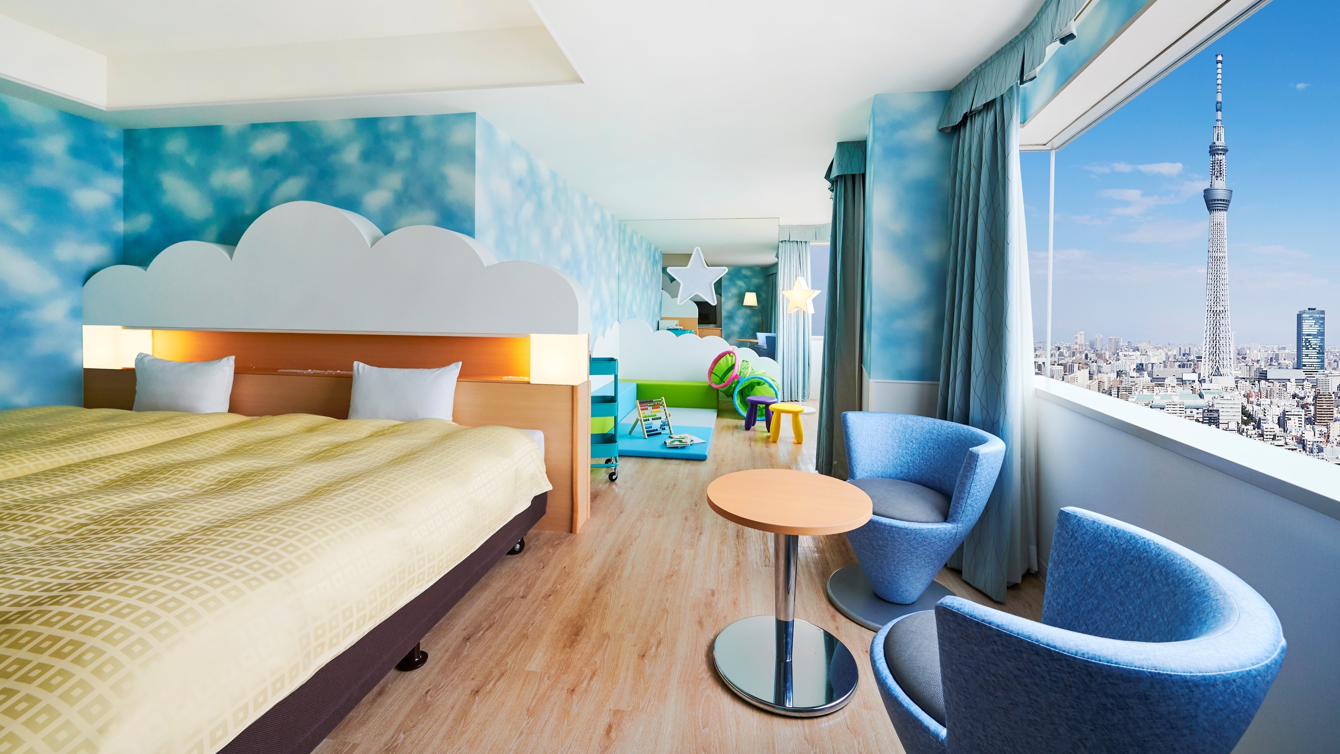 0歳から未就学のお子様が安心して快適にお泊りいただけるように配慮したお部屋は、青い空と白い雲をイメージした清潔感のあるデザインとなっており、奥にはプレイマットやお子様用おもちゃ、絵本、スツールをご用意しています🎵