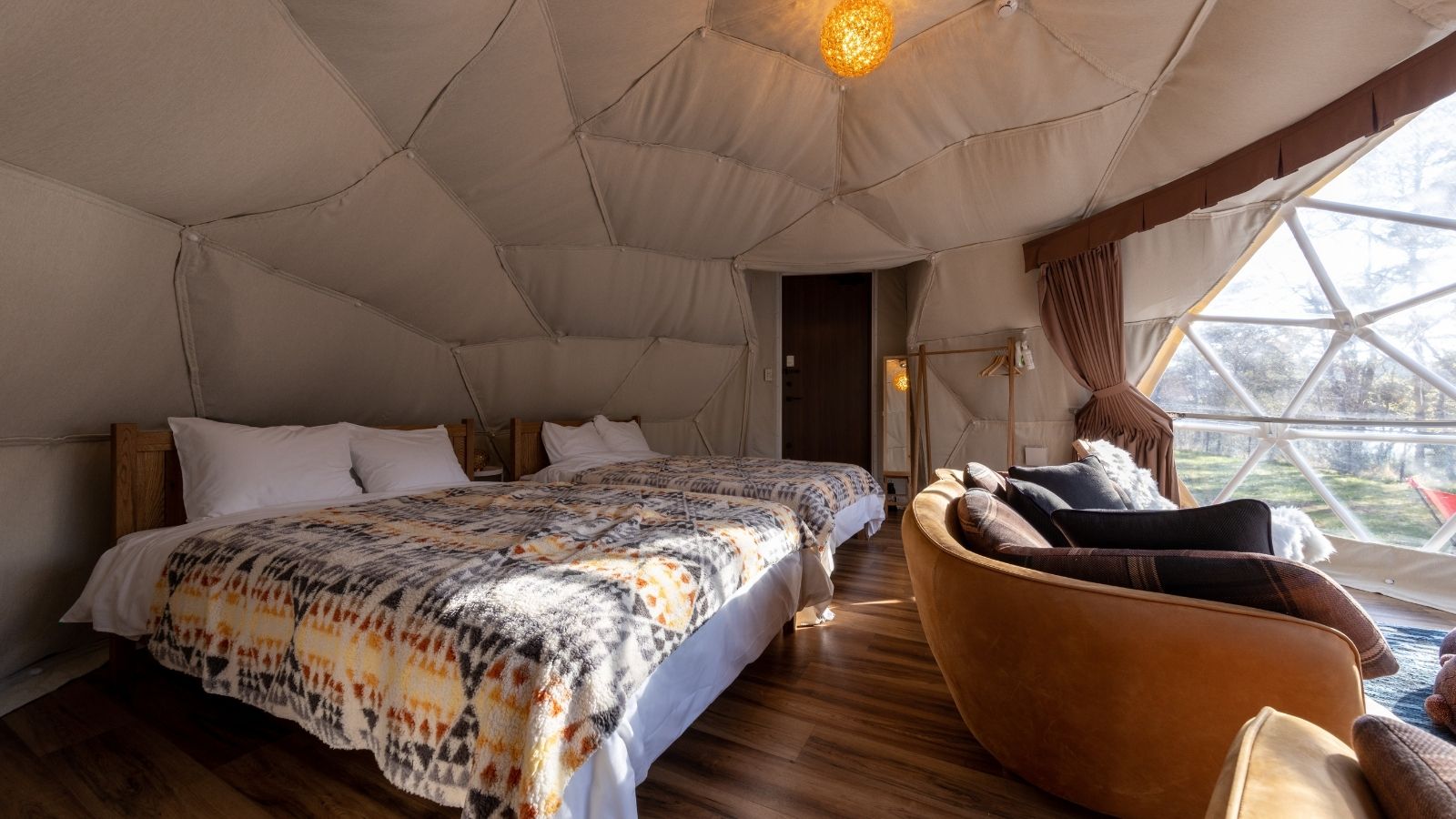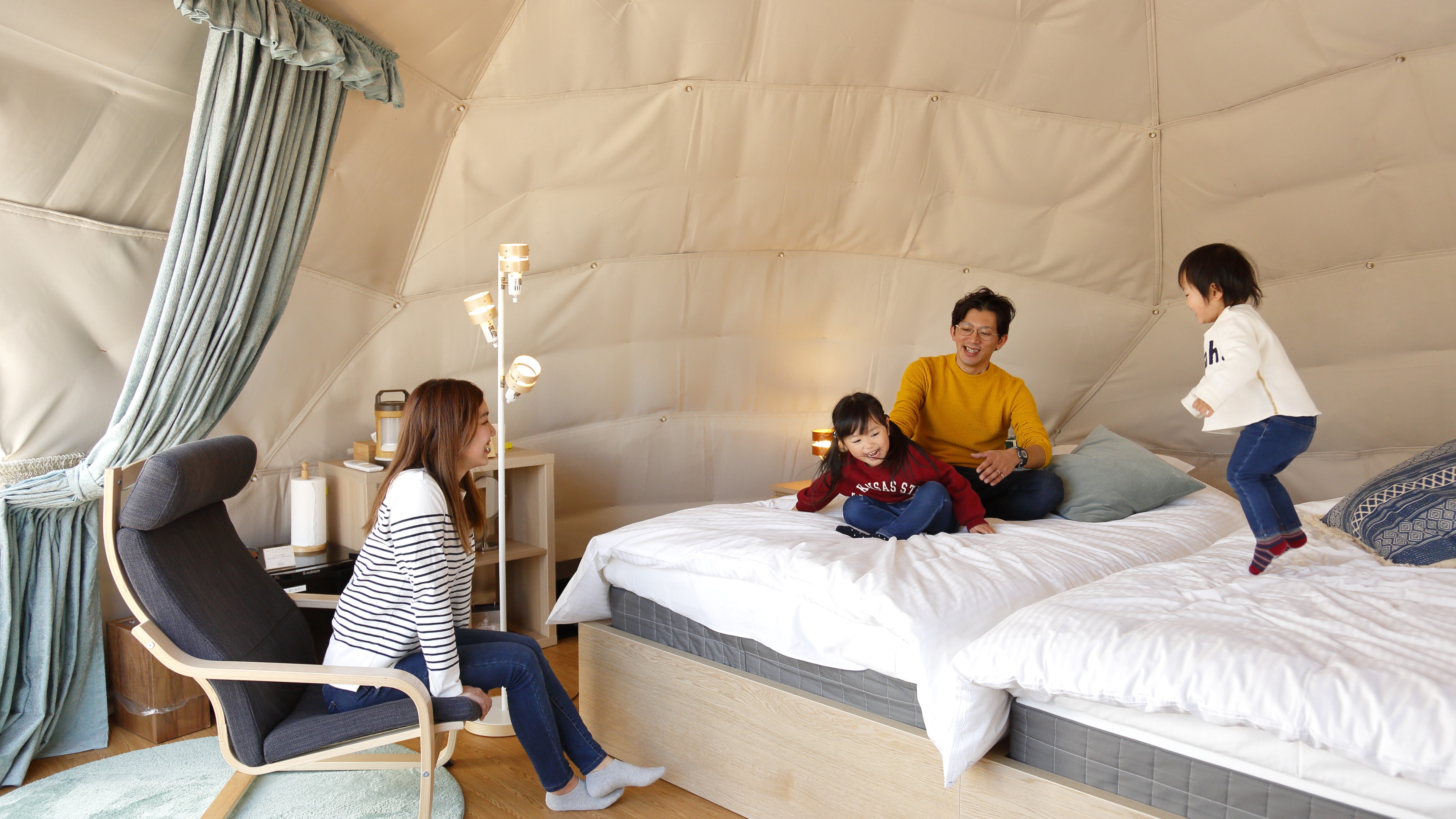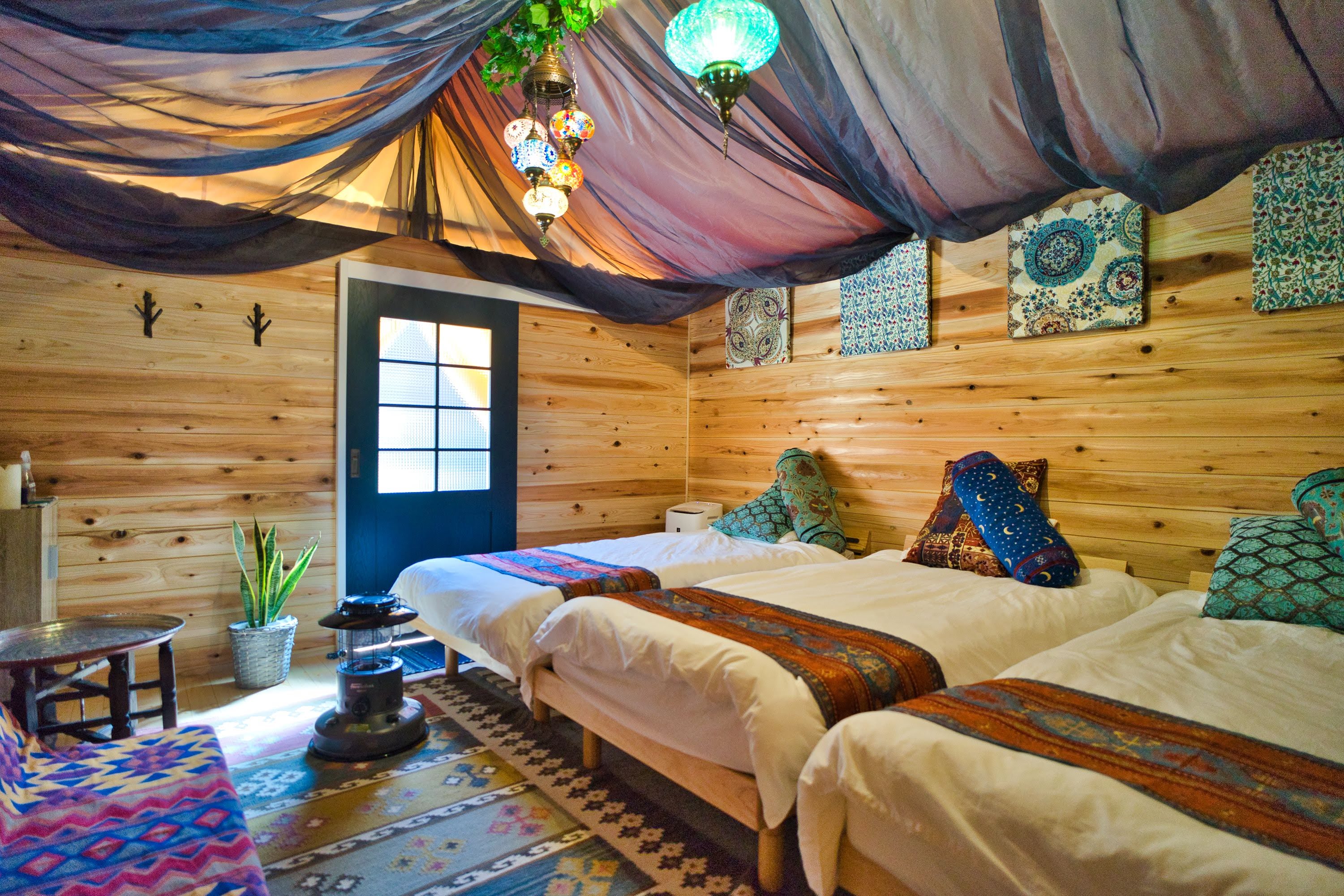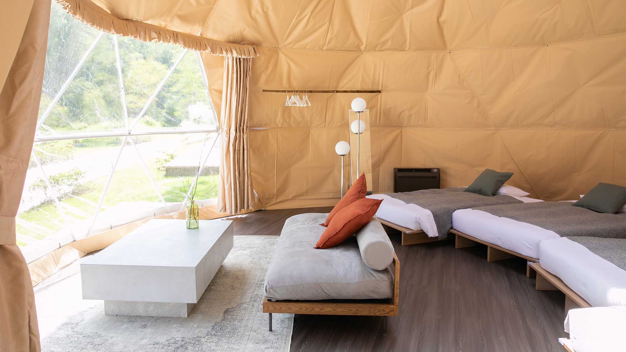 球体テントの他、グランピングテント(2名向け・3名向け)のテントの中にはベッドとクッションを設えており、広々とお過ごしいただけます!