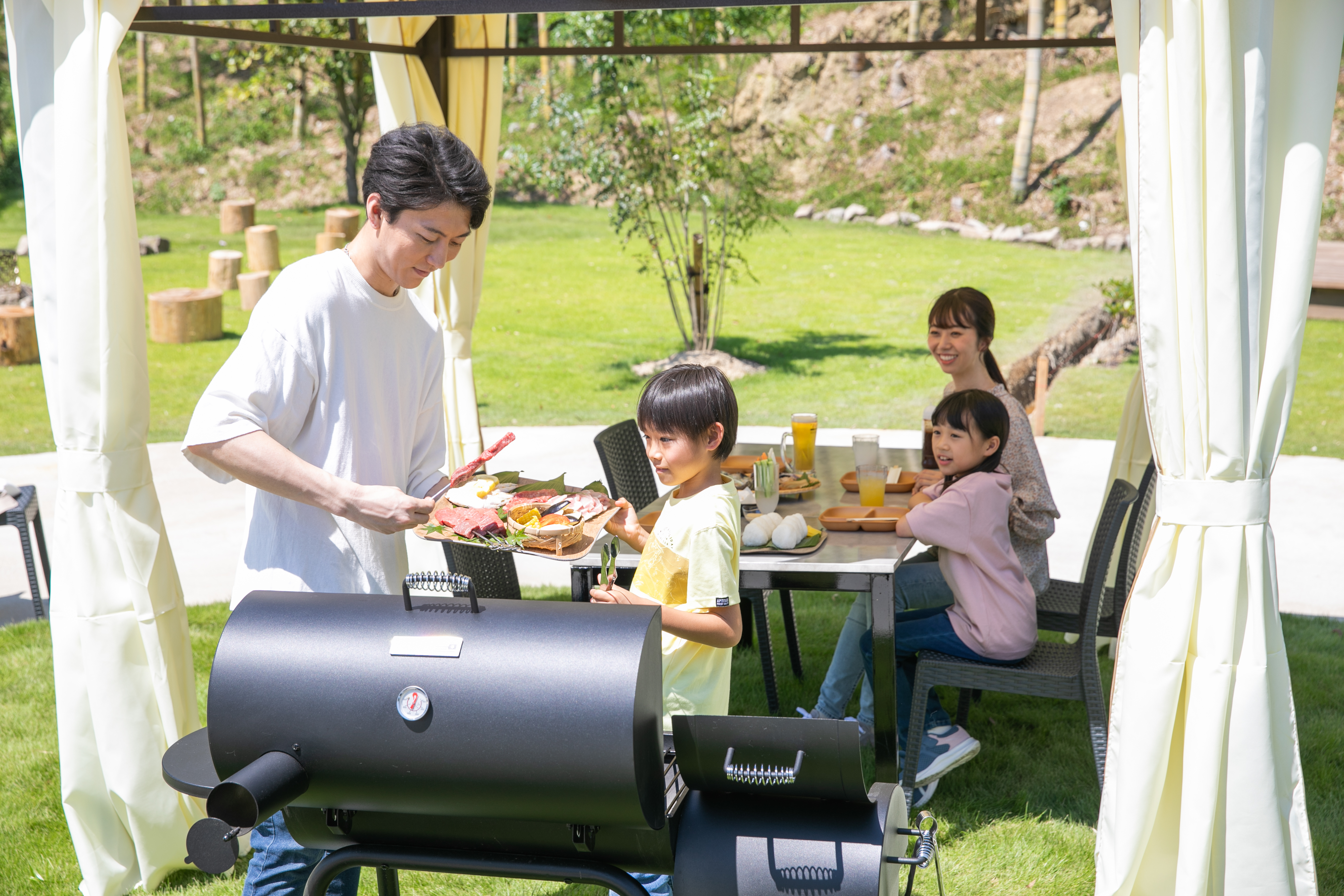 グランピング施設は雨でも楽しめるように、全サイトにガゼボ併設しているので雨の日も安心してBBQをお楽しみいただけます🎵