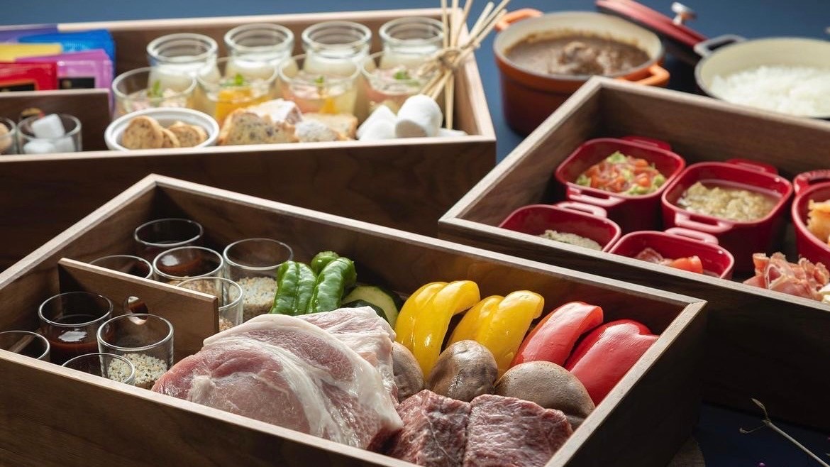 「保古グランピング」では、アウトドアスタイルの醍醐味であるBBQはもちろん、前菜からデザートまで、個性あふれる唯一無二、コース料理のようなオシャレディナーをご堪能いただけます。