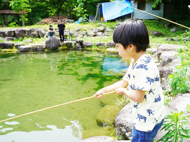 どなたでも手軽に魚釣りを体験する事ができる「渓流釣り掘」は、お子様の釣りデビューや家族で楽しむ自然体験としても最適です。