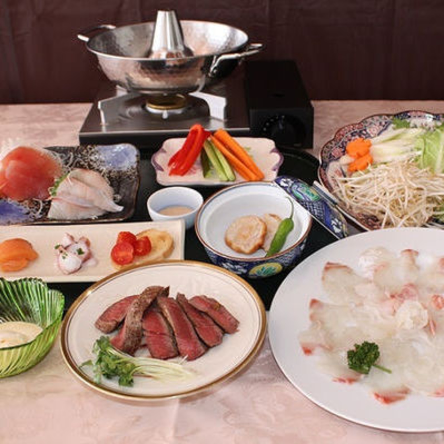 伊豆の素材を活かしたMERCIオリジナル料理はペンションでは珍しく金目鯛をしゃぶしゃぶにてご用意、さらに国産牛のサーロインステーキとお魚マイスター厳選の新鮮な地魚の盛り合わせ、お好みで〆の雑炊もお楽しみ下さい🎵