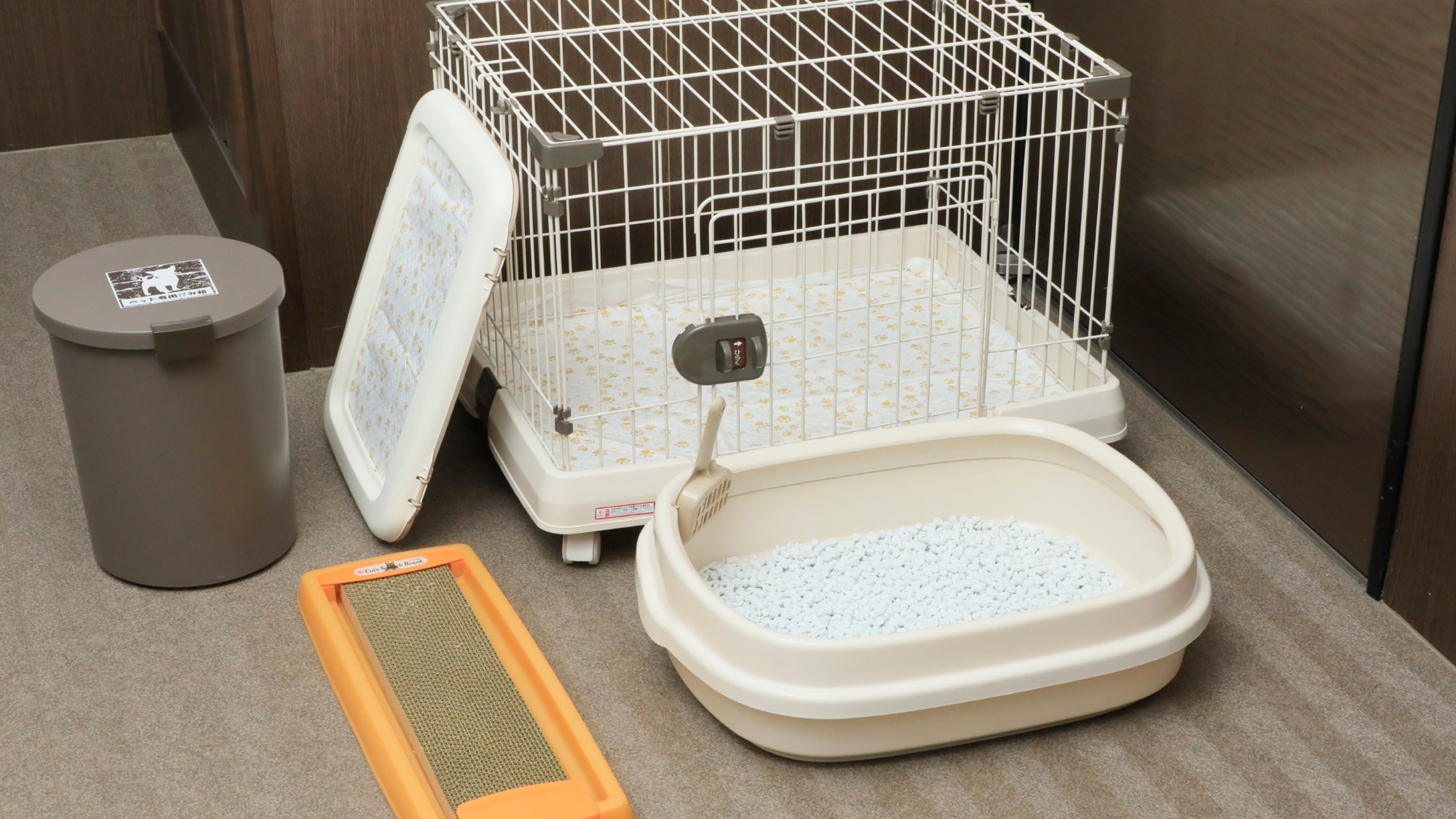 フードボール、ゲージ、ペットシート、汚物処理袋、消臭スプレーなど常備。