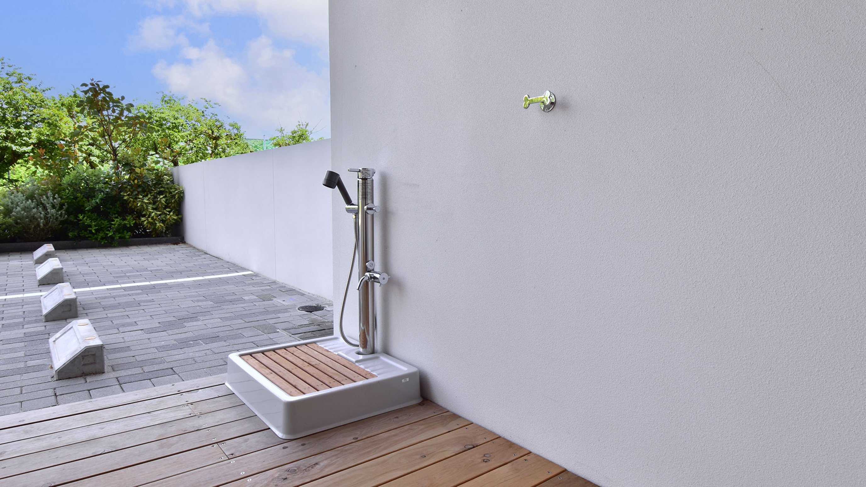 施設エントランス外に、ワンちゃん専用の足洗場、リードフックを完備していますので、お散歩や外遊びの後など施設へ入る前にご利用ください。