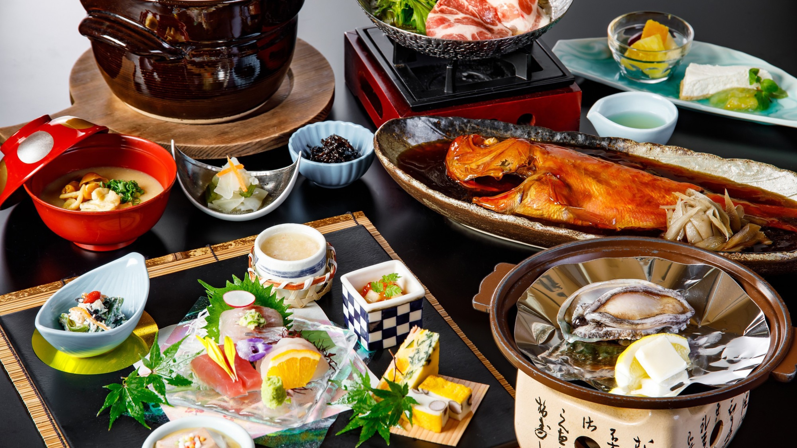 お食事処にご用意するご夕食は四季を彩る会席料理。季節毎に厳選された素材 を使い、秘伝のタレで煮込んだ「金目鯛の姿煮」をはじめ、旬の味をお楽しみください!