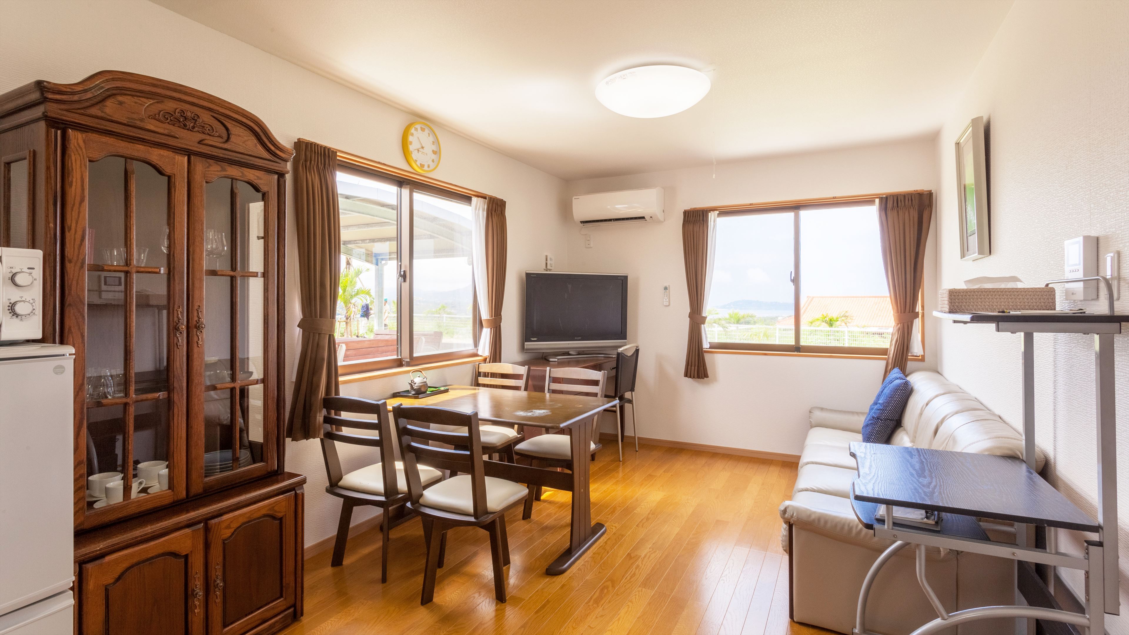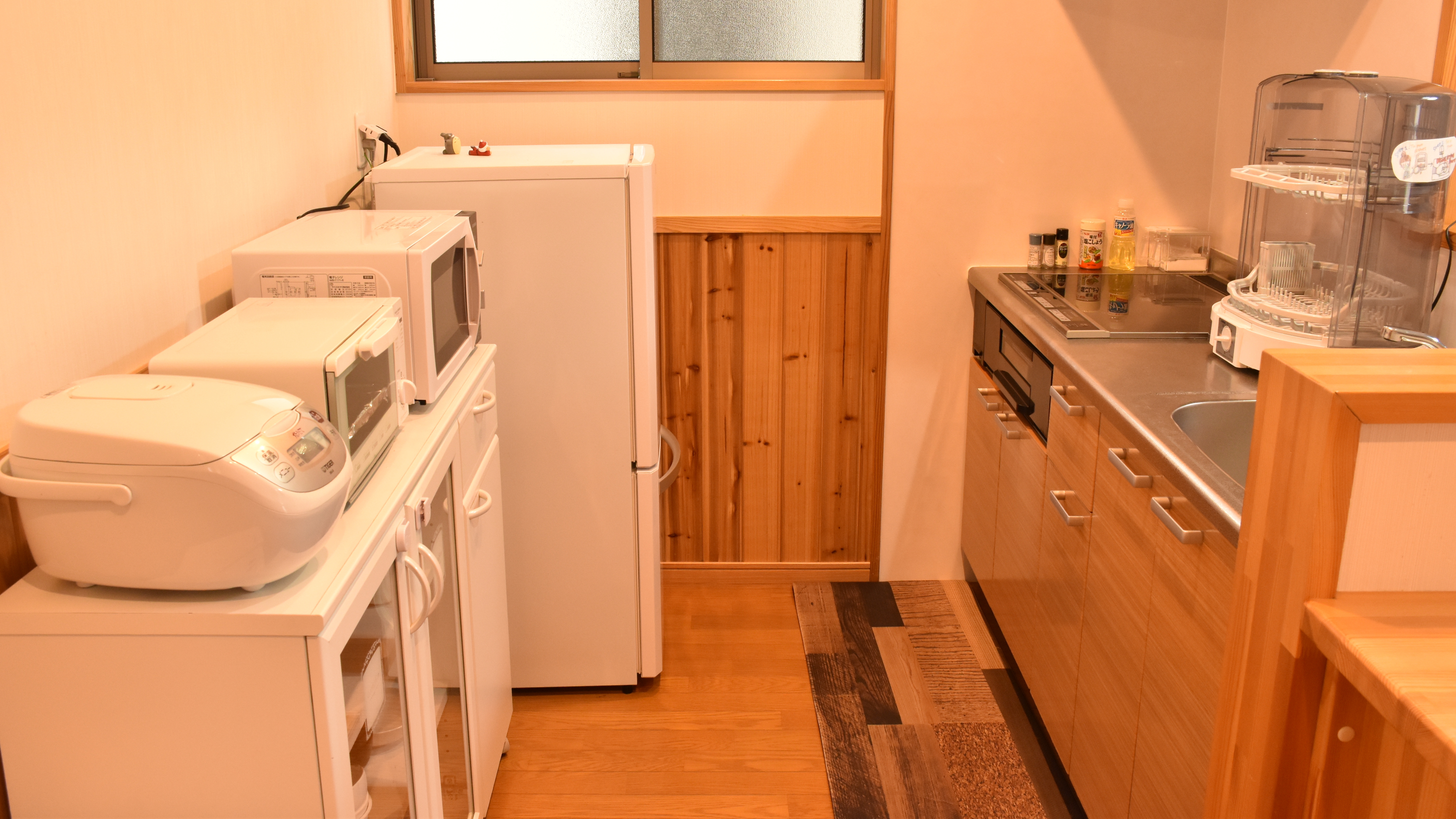 キッチンには冷蔵庫、IH調理器、電子レンジ、炊飯器、コーヒーメーカー、ケトル、調理器具、食器一式揃っていますので快適にお料理を楽しむこともできます。
