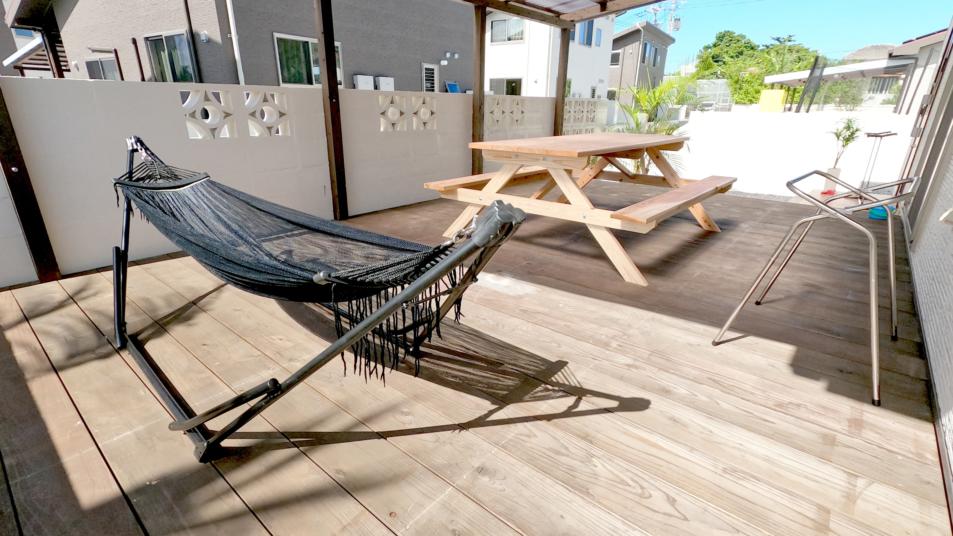 「三角屋根」同様、 庭に面したウッドデッキや芝生の庭でバーベキューもできます。