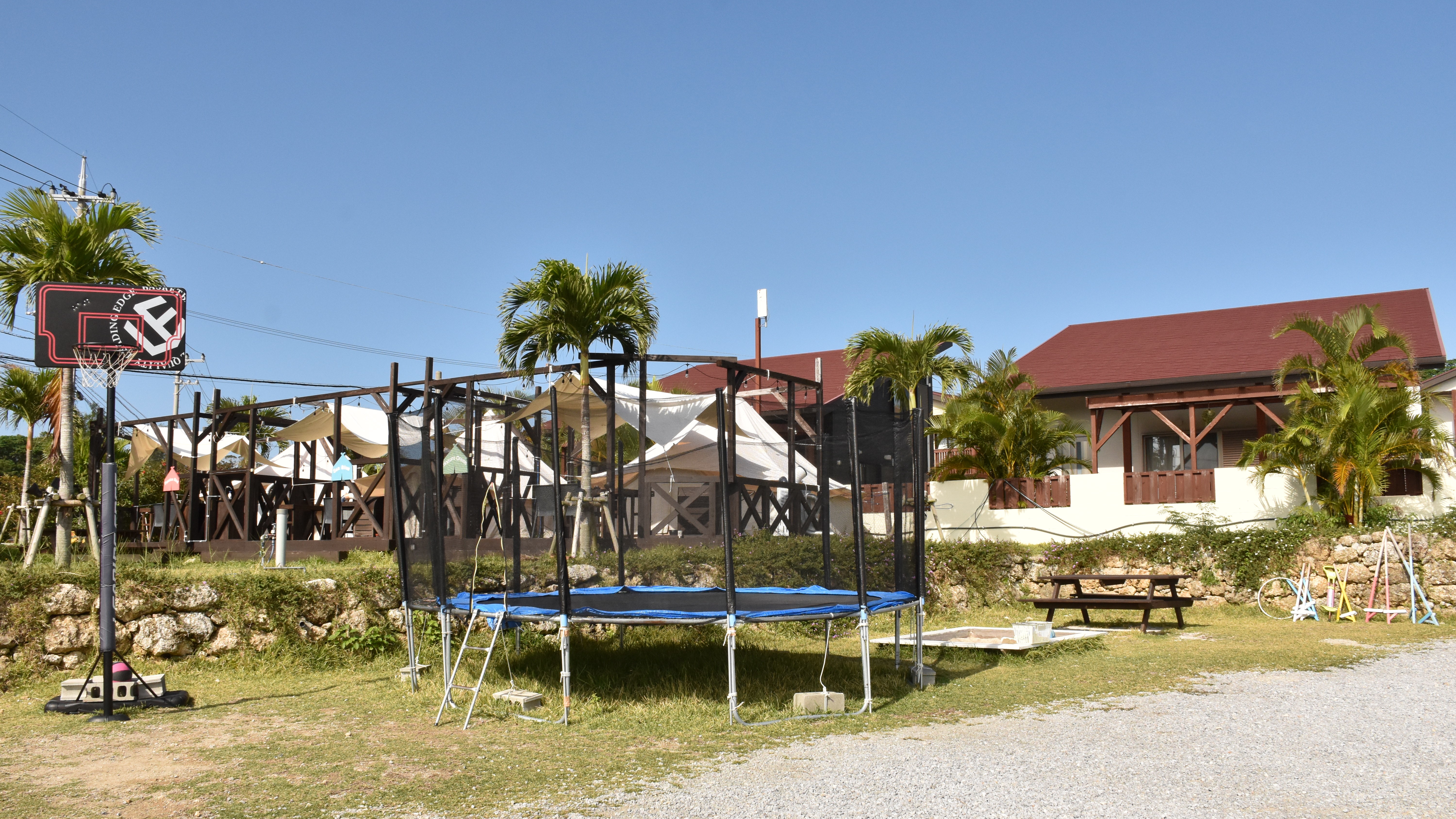 ベビーチェアやベビーソープ、お子様用椅子など小さなお子様連れでも安心の充実したアメニティはもちろん、巨大トランポリンやバスケットゴール、砂場など広い敷地内で遊ぶ子どもたちを見ながらゆっくりと流れる沖縄の時間をお楽しみいただけます。