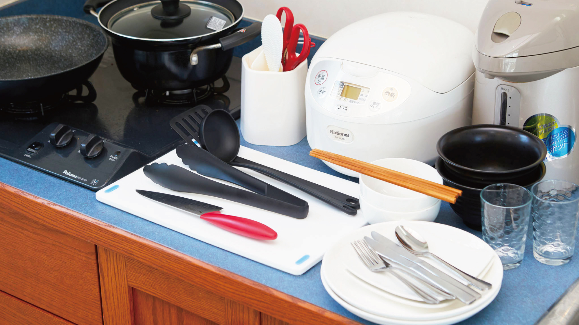 何泊でもご利用いただけるように自炊が可能なキッチンとキッチン用品を多数用意しています。