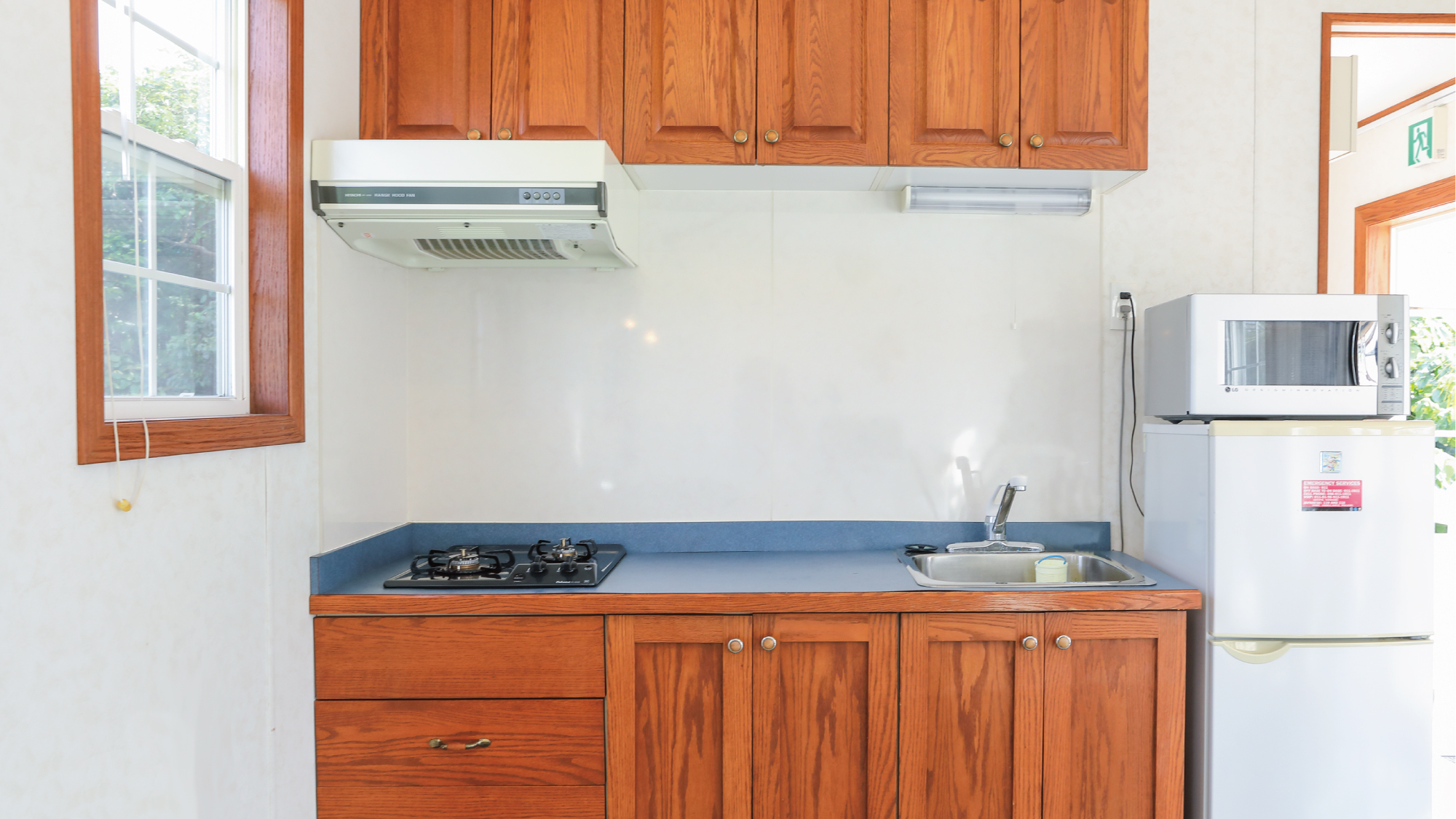 全ての建物にキッチンがついており、電子レンジ、炊飯ジャー、電気ポット、オーブントースター、調理器具一式、食器などが備え付けられています。