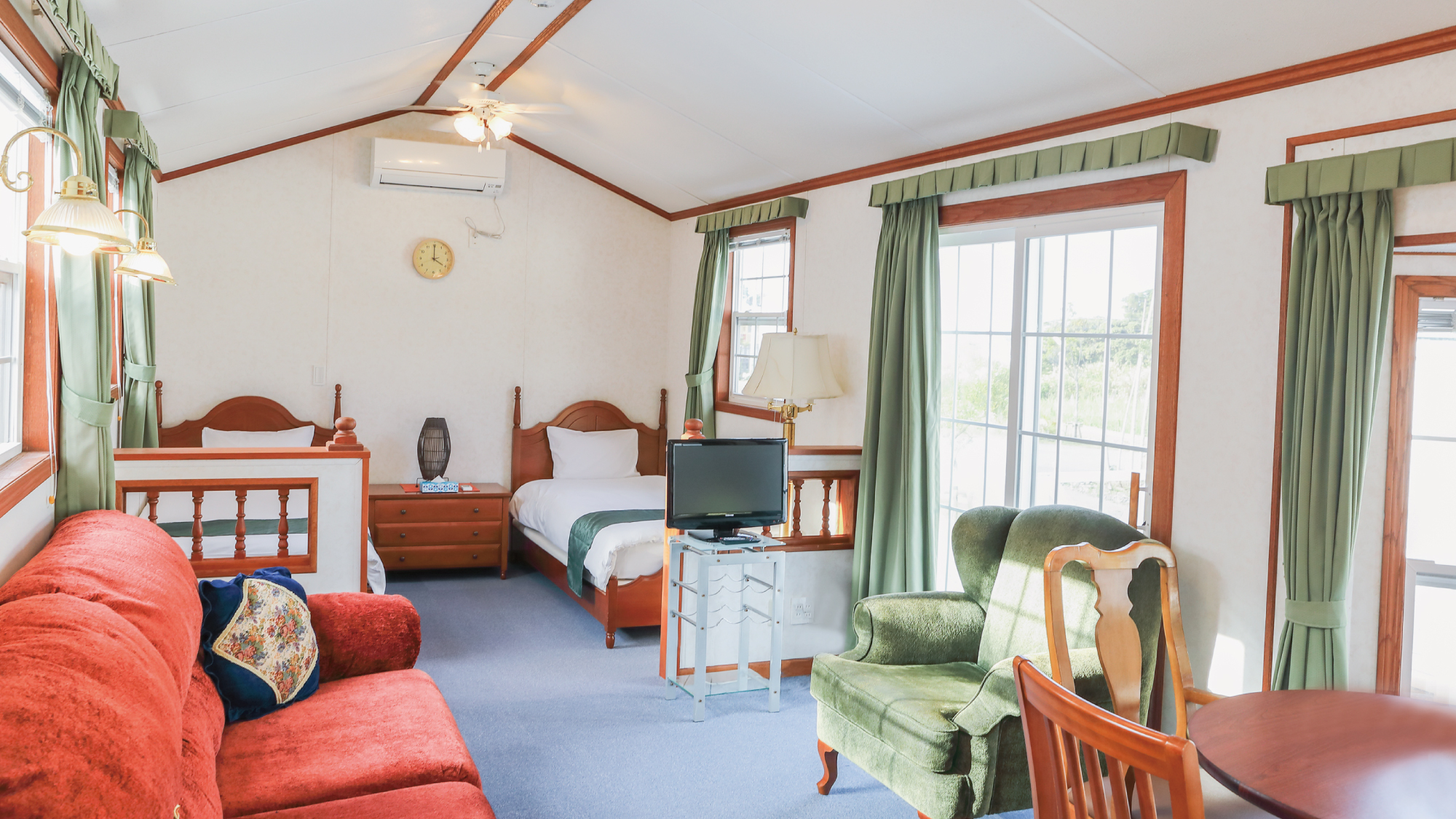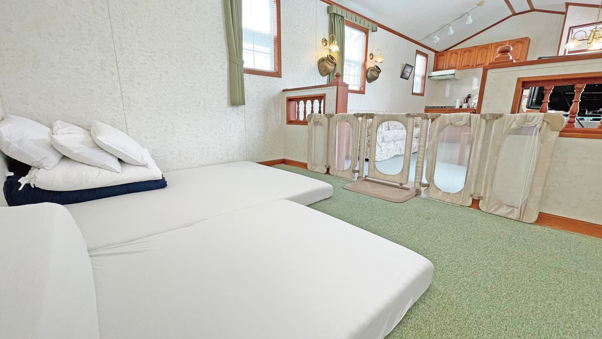 赤ちゃんや小さなお子様連れの旅行に最適なファミリー向けコテージには、カーペット上にマットレスを設置していますのでお子様がベッドから落ちてしまう心配がありません。