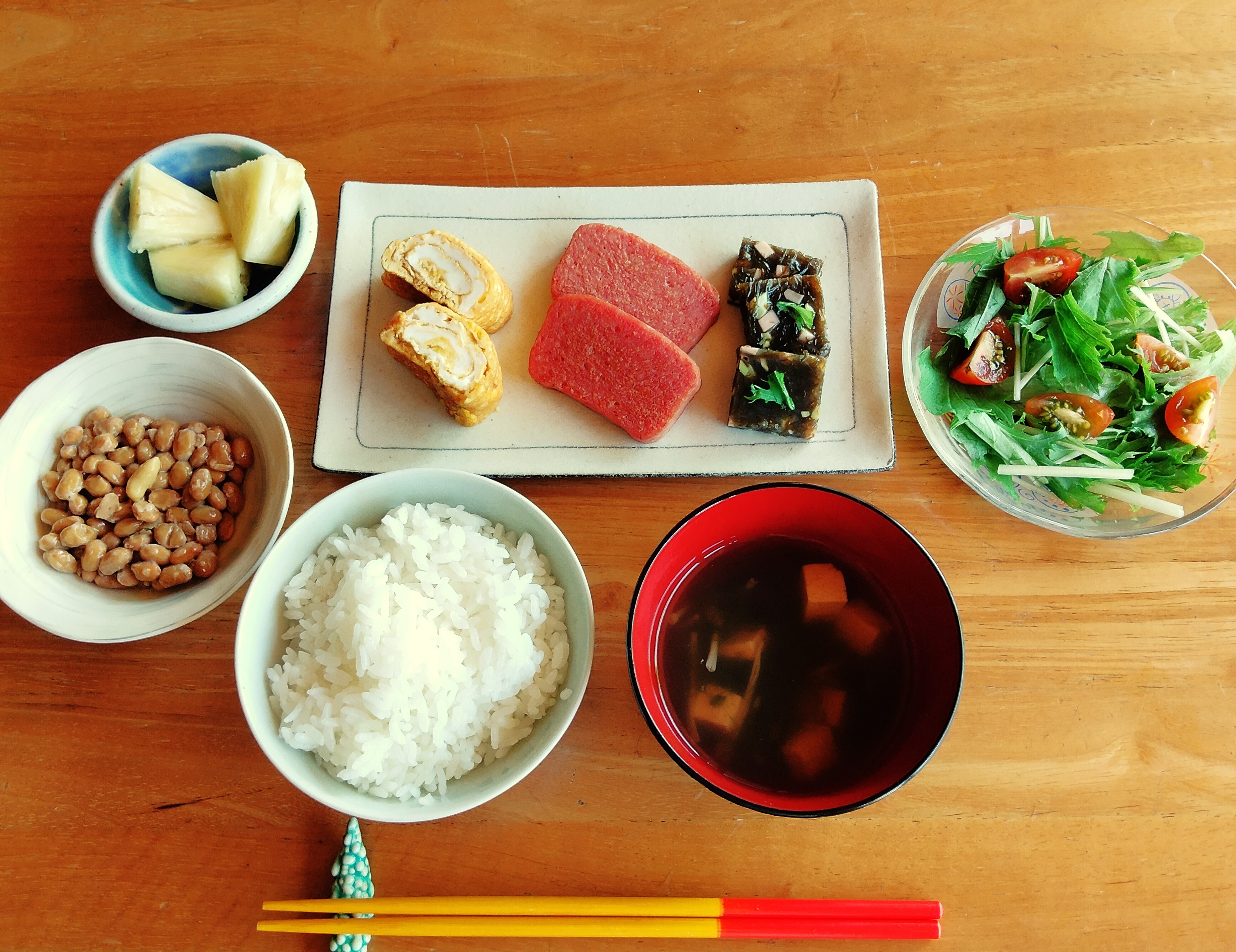 - ポーク卵、季節のサラダ、じゅーしーおにぎりorパン(日替り)、スープ(小学生以上750円/人、幼児450円/人)