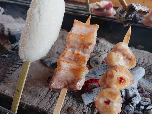 茅葺き屋根が象徴の「グリーンビレッジ横川 かやぶきの館」には囲炉裏があり、その囲炉裏で、串に刺した五平餅や、川魚などを炭火でじっくりと焼いて頂くことができます!