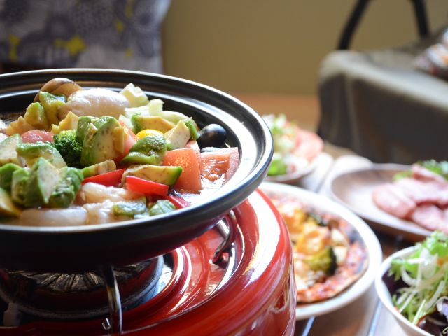 (海老、イカ、カキ、アボカド、ナス、しめじ、アンチョビ、バゲット)