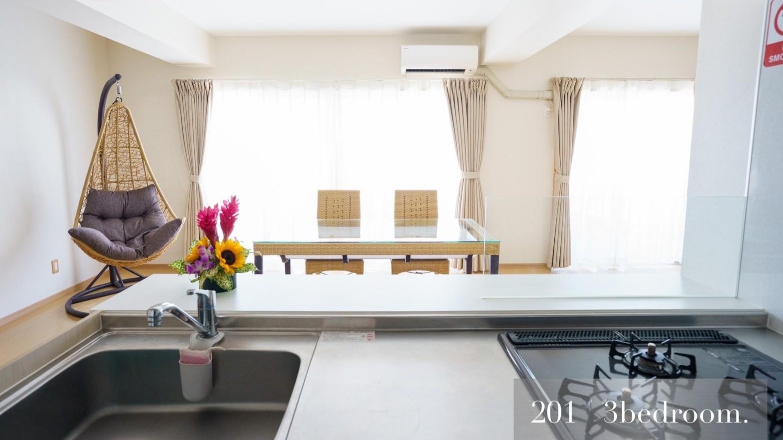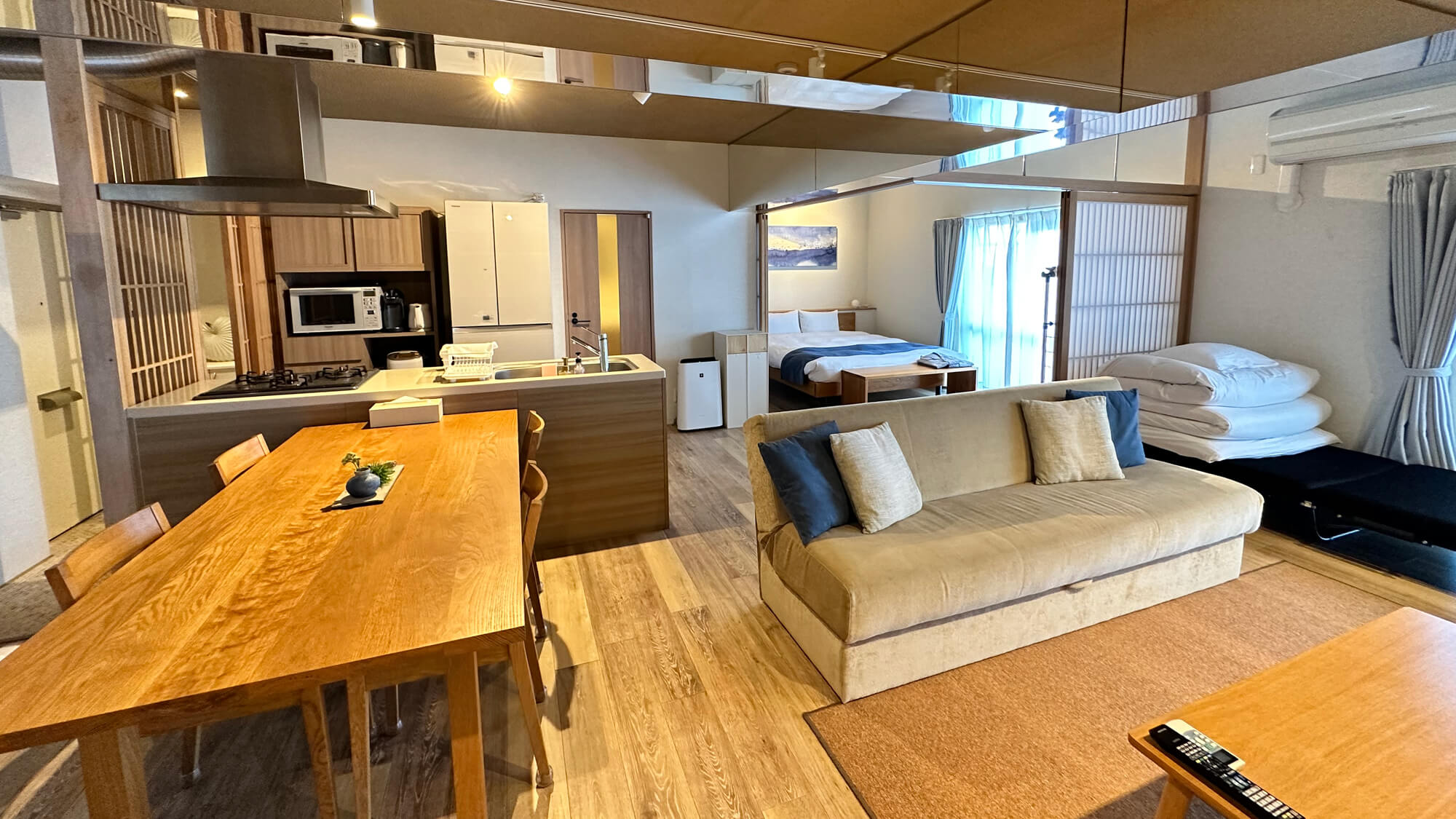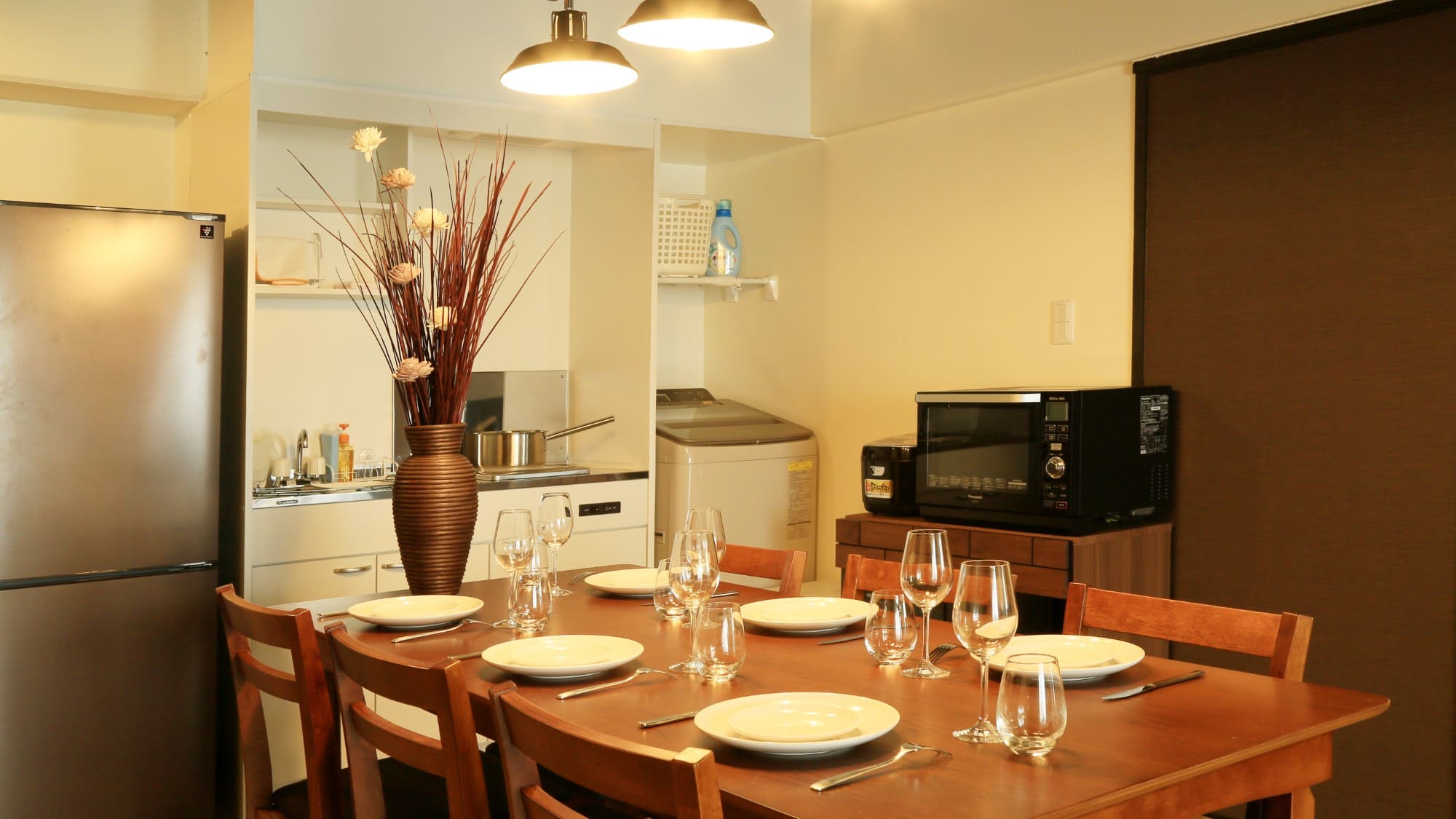 明るくくつろげる空間には、キッチン、洗濯機完備となっており、長期滞在、女子会やグループ旅行での宿泊にもおすすめです。