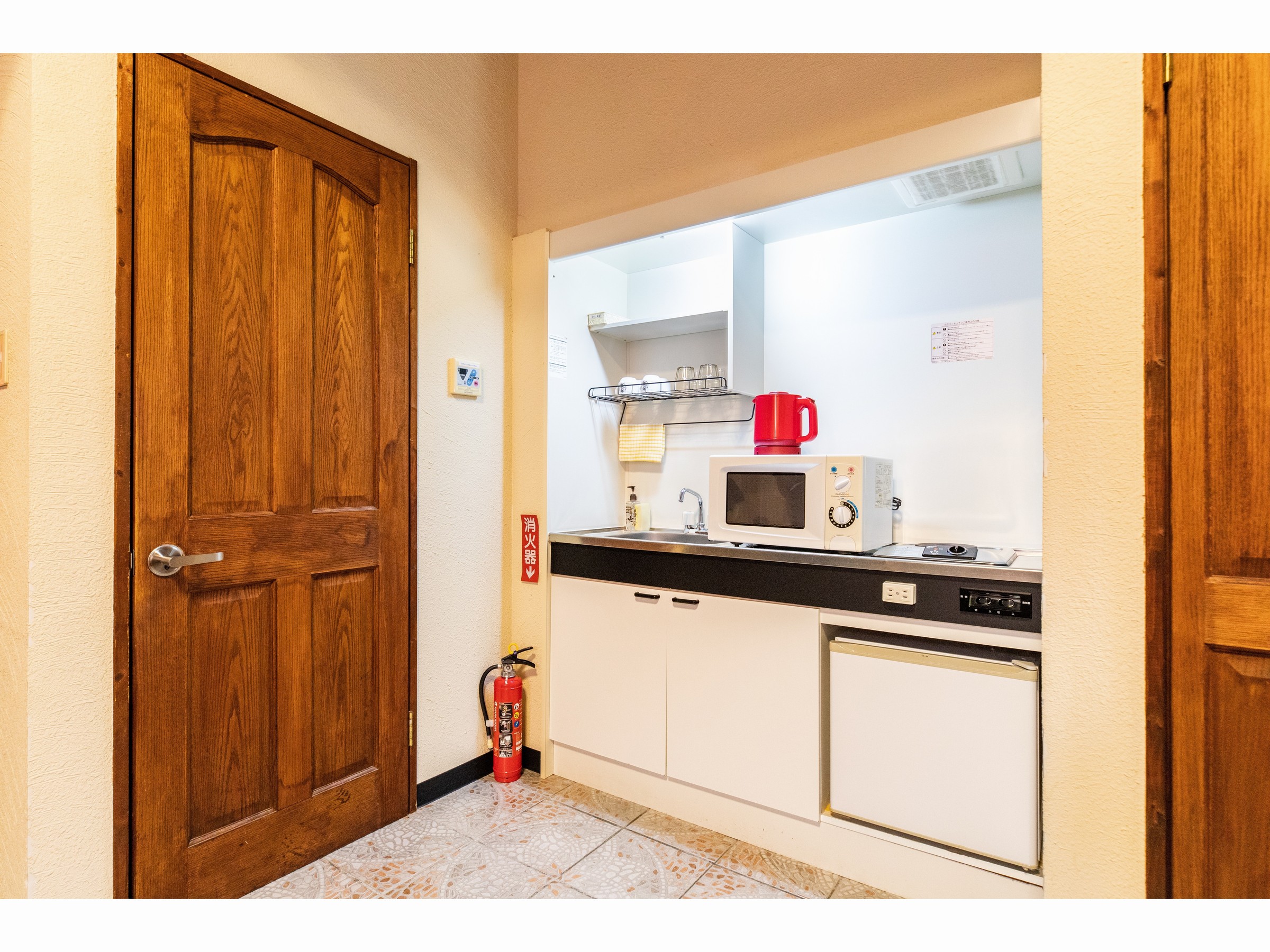 冷蔵庫、電子レンジ、コンロ、ポットもあり、別荘のように滞在することが可能。