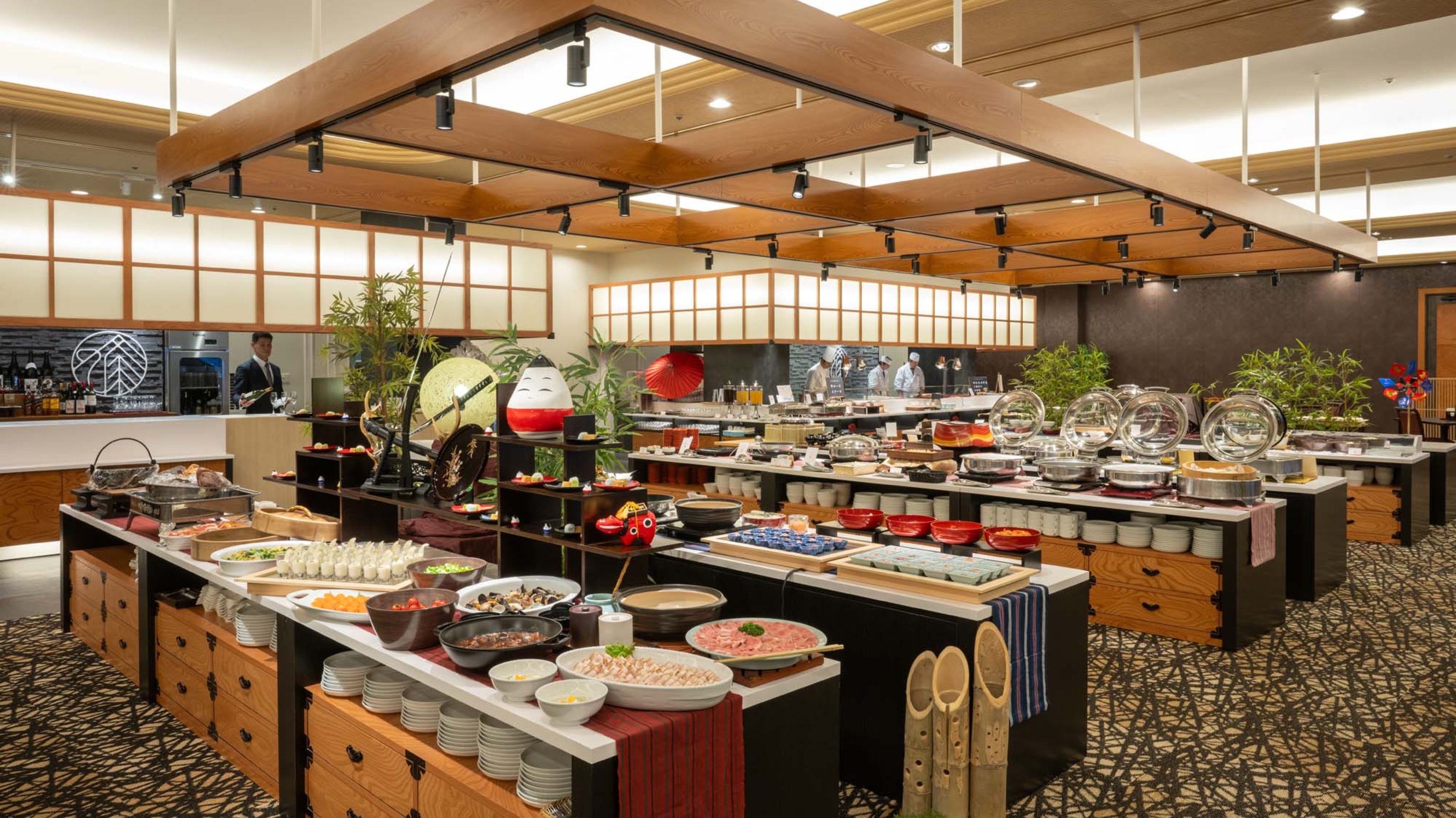 「ビュッフェ」ではリニューアルしたレストランで、東北や会津の料理を中心に、30種50品以上のメニューをお召し上がり頂ける他、臨場感溢れるライブキッチンやお子様コーナーも充実🎵
