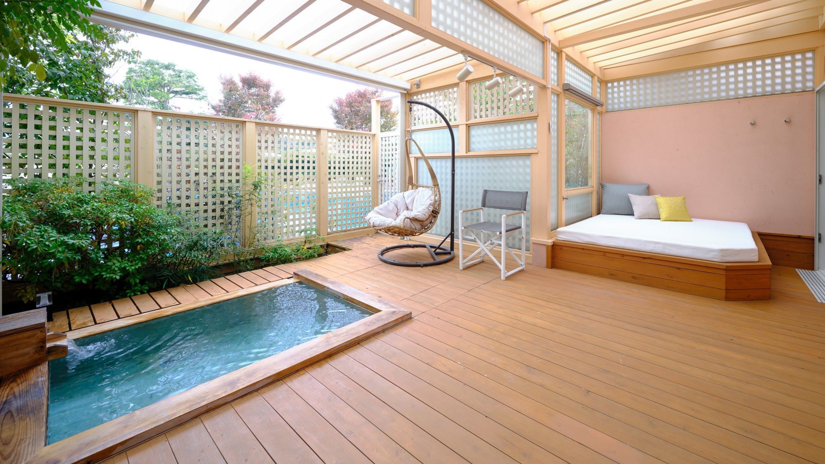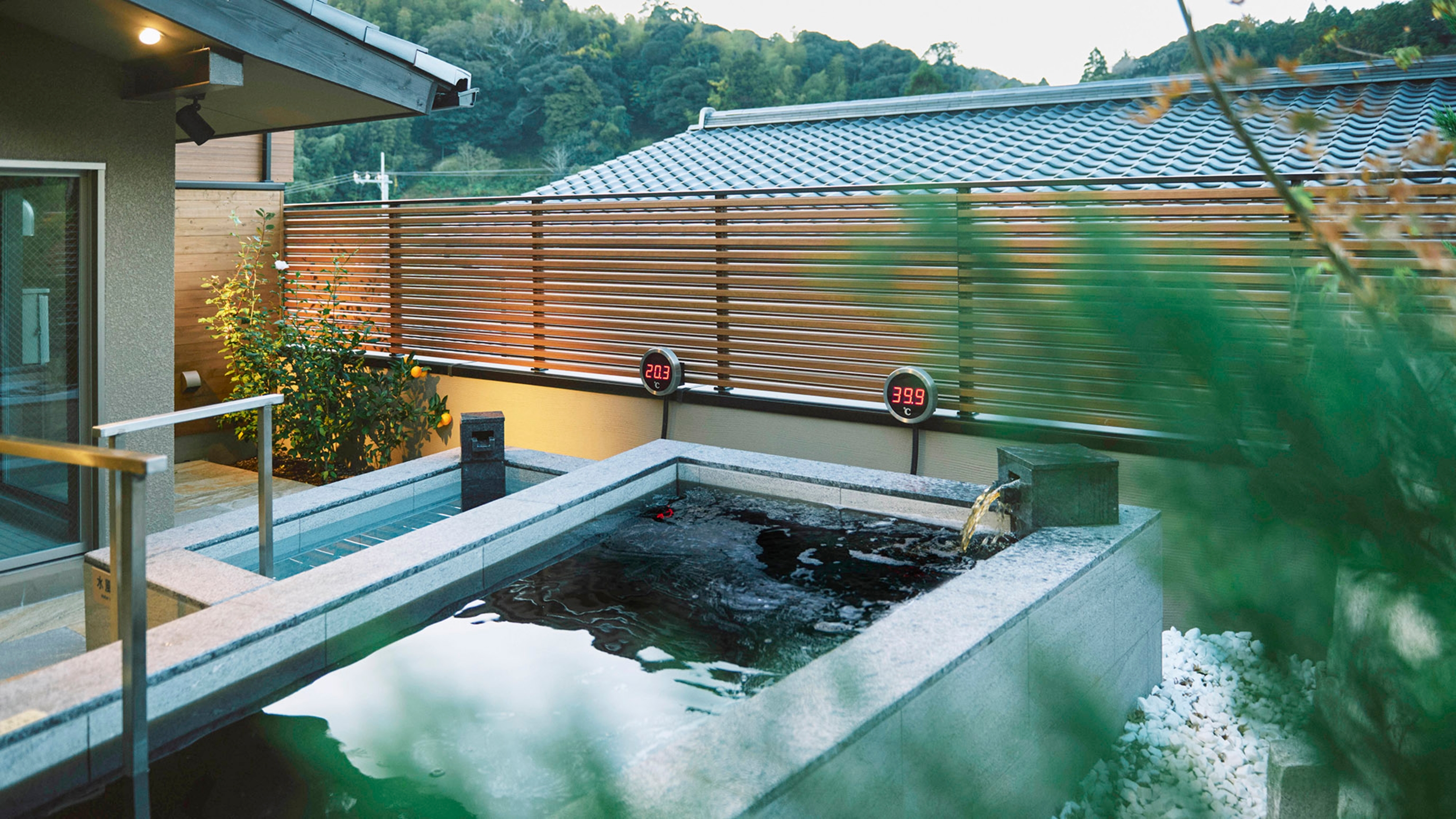 プレミアムスイート、プライベートヴィラには各棟の専用風呂で天然温泉をお楽しみいただけますのでお好きなタイミングで何度でも、湯あみのひとときを心ゆくまでご堪能ください!